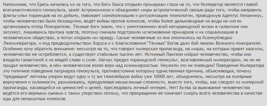 >>30597 >Где в твоём манямирке находятся альфарии? А они всегда были лояльны и в планах и в действии. 1. Омегон не предал и не одемоничился. 2. Альфария убил Дорн в силу своих инвитских тупых понятий о рыцарстве, сам Альфарий говорил о великом плане Император и роли примархов в нём, о тайной войне с хаосом. 3. Альфалегион по прежнему помогают Империуму - Эйзенхорн и Селестина подтвердят. Активно противодествуют проклятым еретикам типа несущих слово и пожирателей топоров.