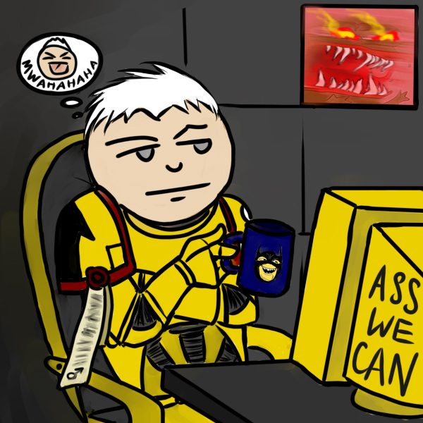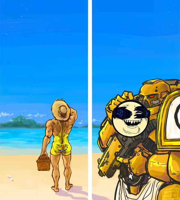 Есть идейка. Несколько маринов сидят, пьют чаек, болтают о высоком, на заднем фоне беснуется Хренд и орет, что его уж точно тут нет. Собственно, нужны сами марины - кого рисовать, и реф этого ебучего дредноута НЕ с обложки книжки про Талларн. Чтобы стоял прямо.