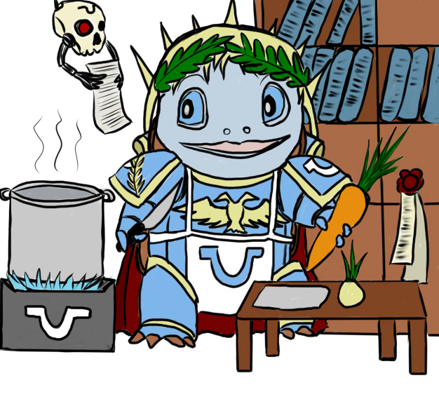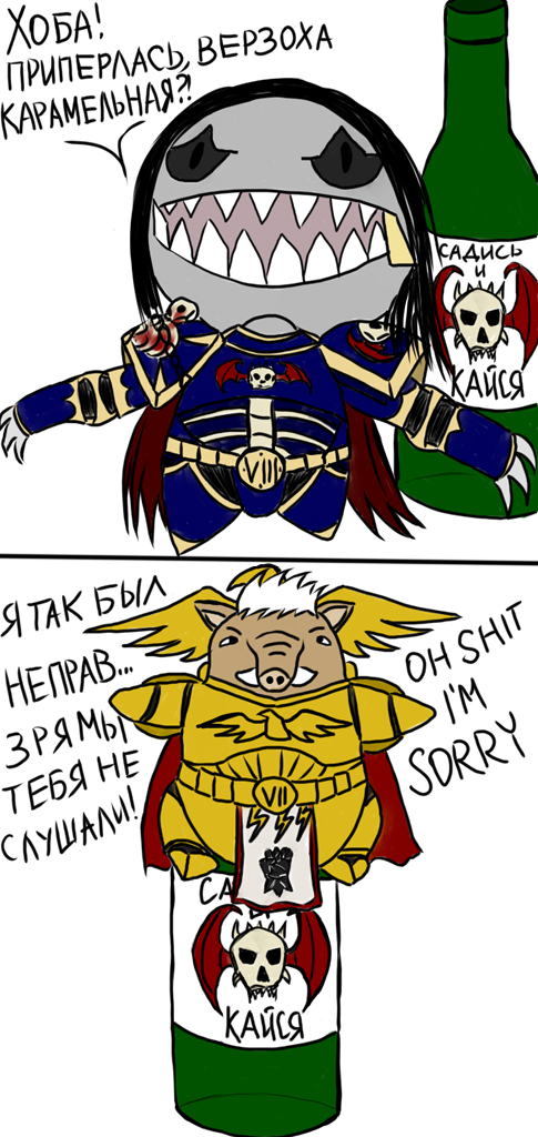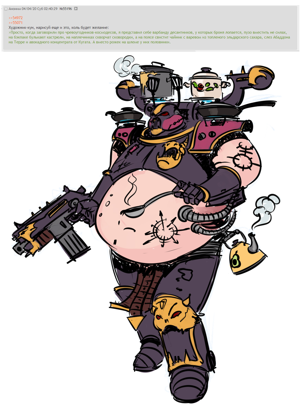 >>54972 >>55071 Художник-кун, нарисуй еще и это, коль будет желание: >Просто, когда заговорили про чревоугодников-космодесов, я представил себе варбанду десантников, у которых броня лопается, пузо вместить не силах, на бэкпаке булькают кастрюли, на наплечниках скворчат сковородки, а на поясе свистит чайник с варевом из топленого эльдарского сахара, слез Абаддона на Терре и авокадного концентрата от Кугата. А вместо рожек на шлеме у них половники.