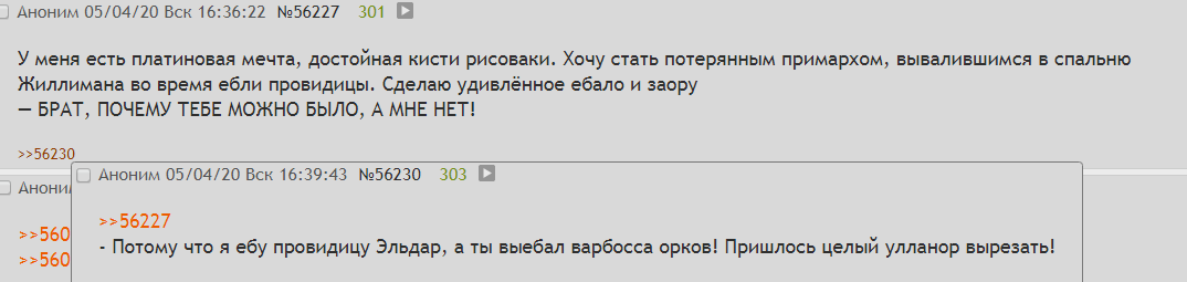 >>60130 >кот их каждый раз предупреждал в стиле "не лезьте блять оно вас сожрет", кота не слушали и каждый раз предсказуемо жидко обсерались Типичные эльдары же. Кот — видящий.
