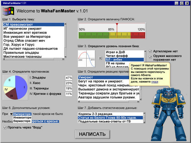 >>36960 Любопытная классификация. Но что делать с: - отбитыми дебилами вроде Хренда? Они вроде только одной-двум фракциям фажут, но и этого за глаза. - недовольными своей фракцией, вот прямо до жути и РРРРЕЕЕ во все поля? - типами, которые ни по кому не фажут и в целом на сеттинг и фракции им похуй, но почему-то они увлекаются вахой? - фанатами, у которых такой ебанутый хедканон, что диву даешься? Всякие гуманоиды и императоры ультрамаринов как раз отсюда.
