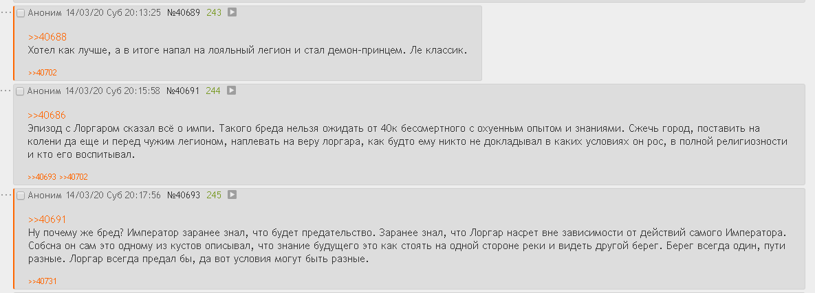 >>40686 Эпизод с Лоргаром сказал всё о импи. Такого бреда нельзя ожидать от 40к бессмертного с охуенным опытом и знаниями. Сжечь город, поставить на колени да еще и перед чужим легионом, наплевать на веру лоргара, как будто ему никто не докладывал в каких условиях он рос, в полной религиозности и кто его воспитывал.