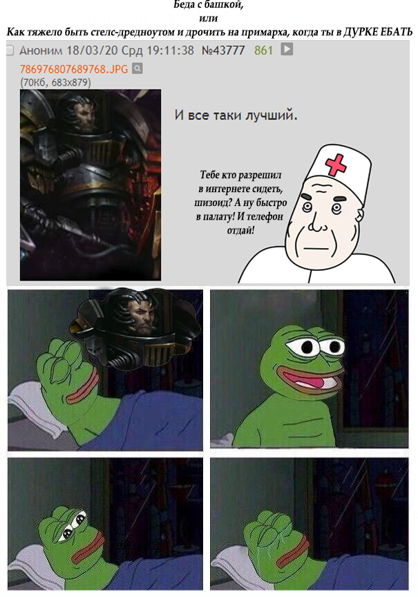 >>44313 >НАДУВНОГО Кстати, в тему Фули, надувных и примархов. Прямо представляется картина маслом: Сцена 1 - Жиллиман в окружении эльдарок, в углу стоит грустный Пепежабо, на которого всем абсолютно и непрошибаемо похуй. Сцена 2 - Лион и Русс, меряются силой, дерутся в лучших традициях гачи и рвут друг другу силовые портки. Пепе пытается обратить на себя внимание, в ответ ноль эмоций. Сцена 3 - Дорн верхом на Кёрзе, тот с довольной физиономией лапает его за сияющие золотом огузки, на заднем фоне закипающий Пепежабо с рожей цвета кхорнитской брони, один шаг до впадания в черное РРРЕЕЕЕ. Сцена 4 - Пепежабо один, в слезах и соплях, к нему подходит Фулгрим с пекафейсом: - Брат, хочешь надувную Каллифону из примархоустройчивого материала? Она даже разговаривать может, вот, тут нажми! Пепе нажимает. Каллифона: - Братик, я говорила тебе, что ты идиот? РРРРРРРРРРРРРЕЕЕЕЕЕЕЕЕЕЕЕЕЕЕЕ услышали даже на Терре.