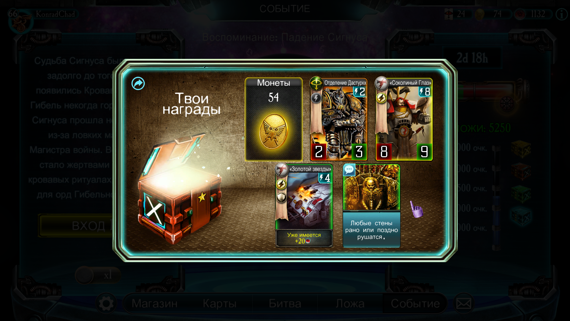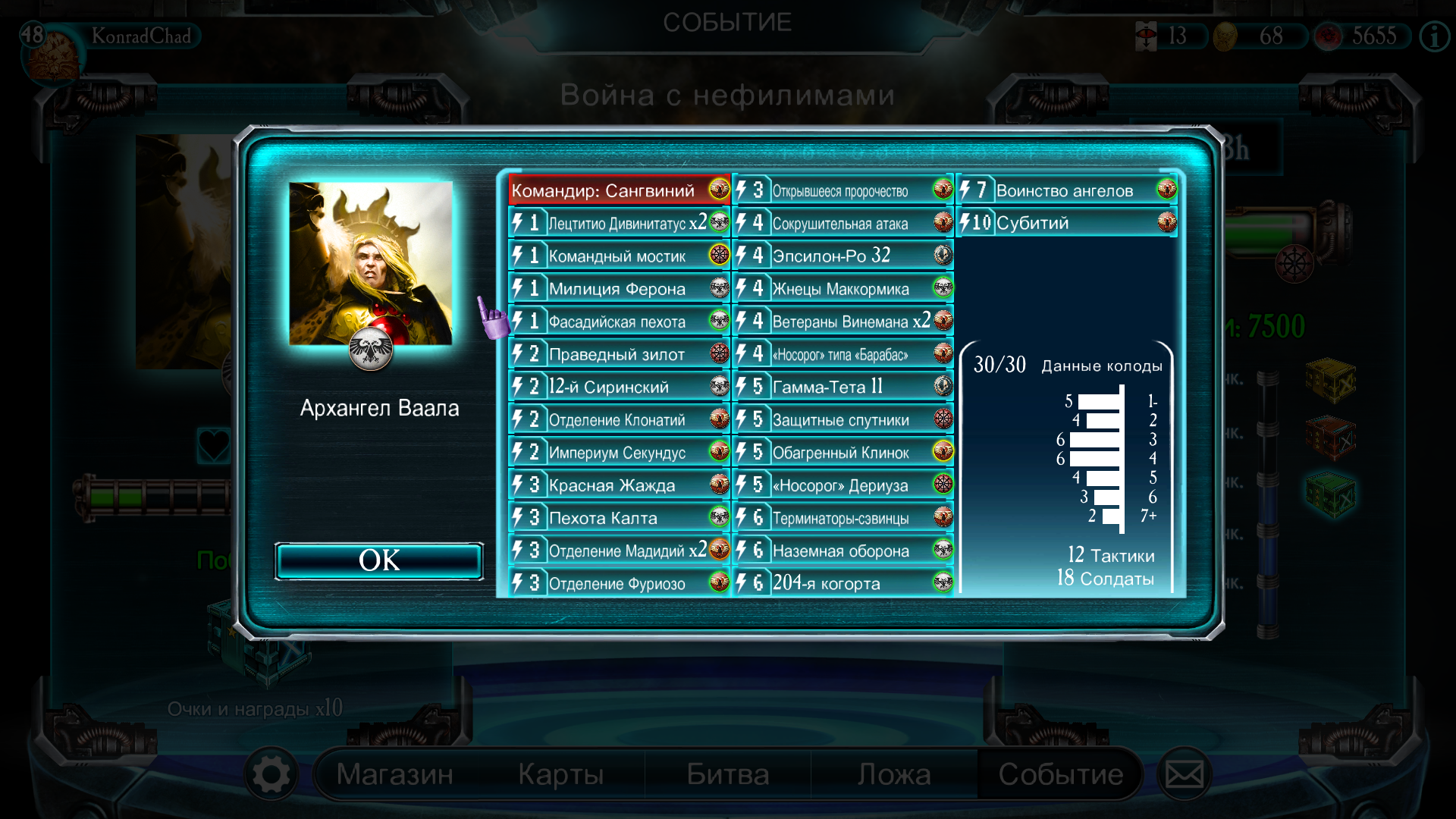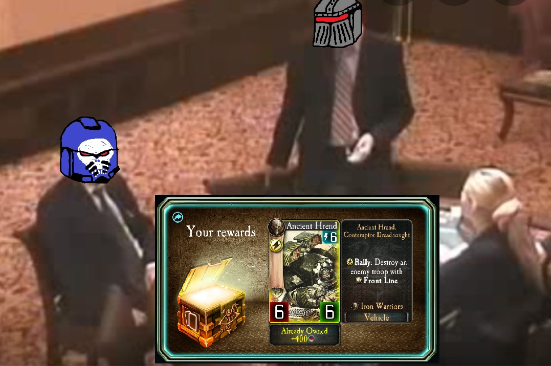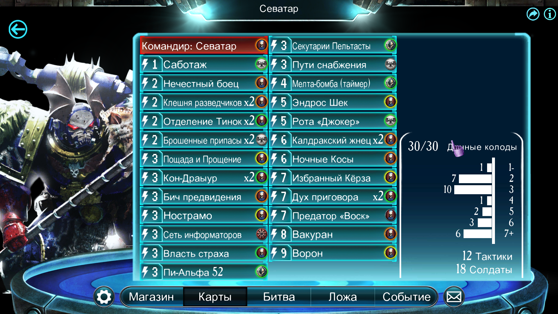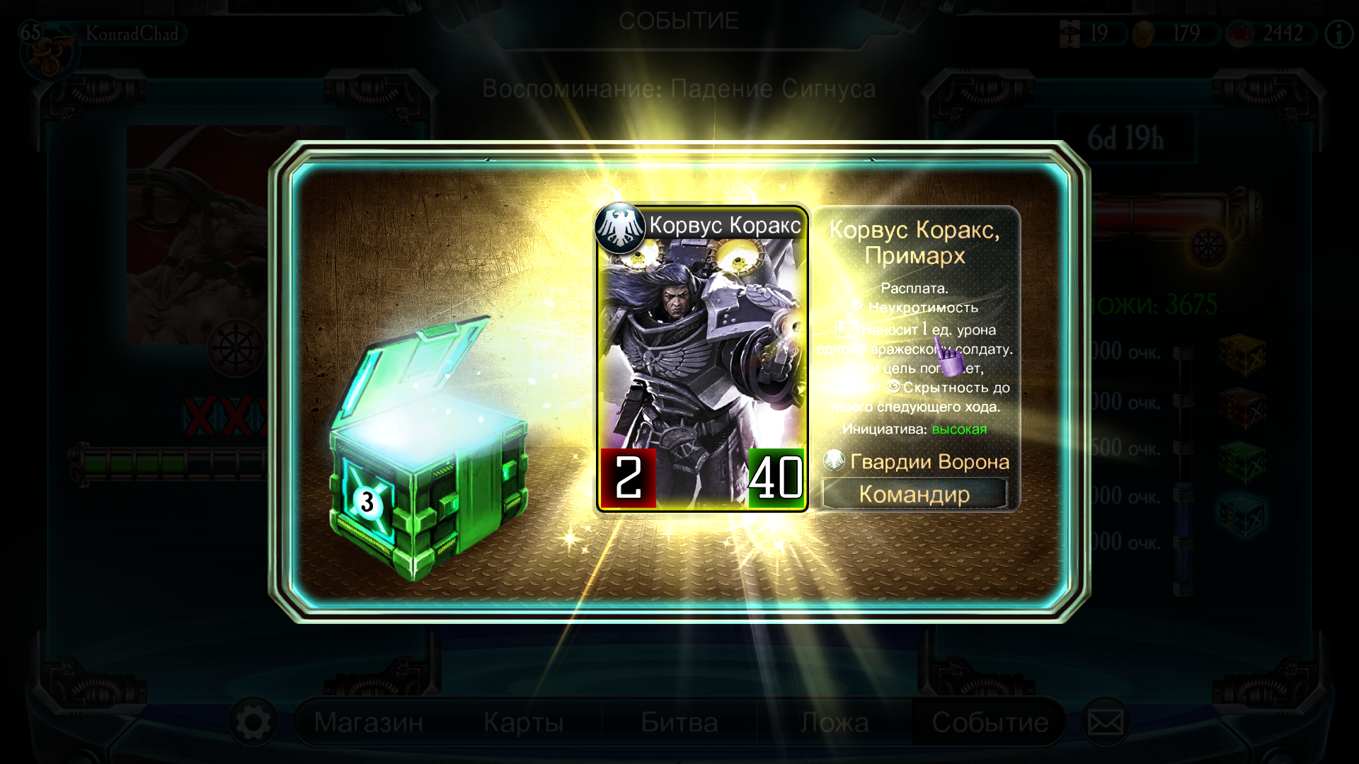 Ладно, дейлики откатал. Пошел в эвент - и скажу, колоды у Сани сосут. Три победы только сделал, два одинаковых сценария поражения: финишная прямая, у меня на руке две карты - БУРОВАЯ УСТАНОВКА, ВАУ, ЧТОБ Я БЕЗ НЕЕ ДЕЛАЛ, и... и... как думаете, что? Обход с фланга для солдат в руке!!! Охуенно, не правда ли? Если вам выпал Саня - только Черный Гнев, остальные колоды СОСУТ, причем не кровь. С сундуков все равно лега выпала, примарх. Мортарион, блядь. Я уже понял принцип их выпадения: игра смотрит, карт чьего легиона у меня меньше всего - и даёт их примарха, в прошлый раз выпал Вулкан.