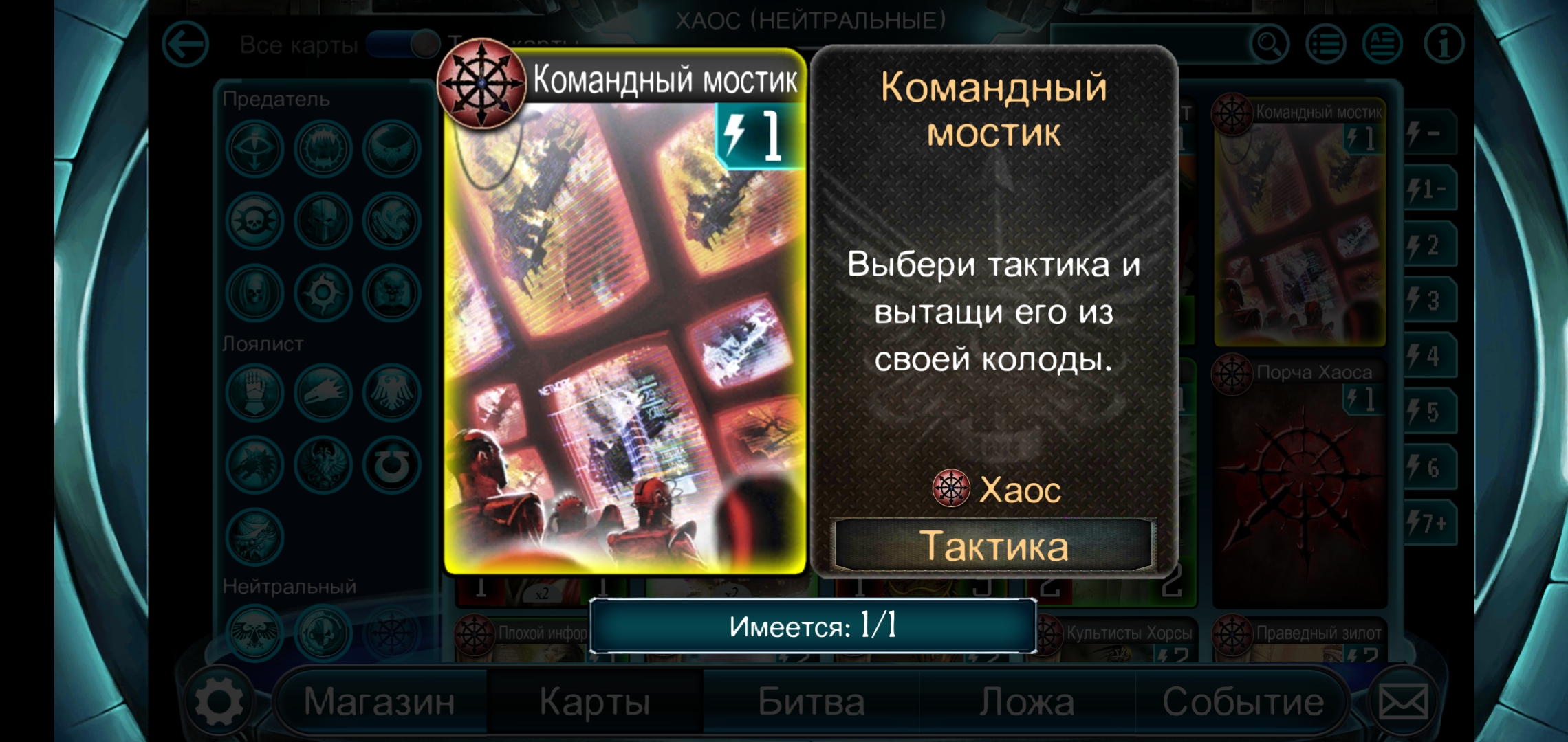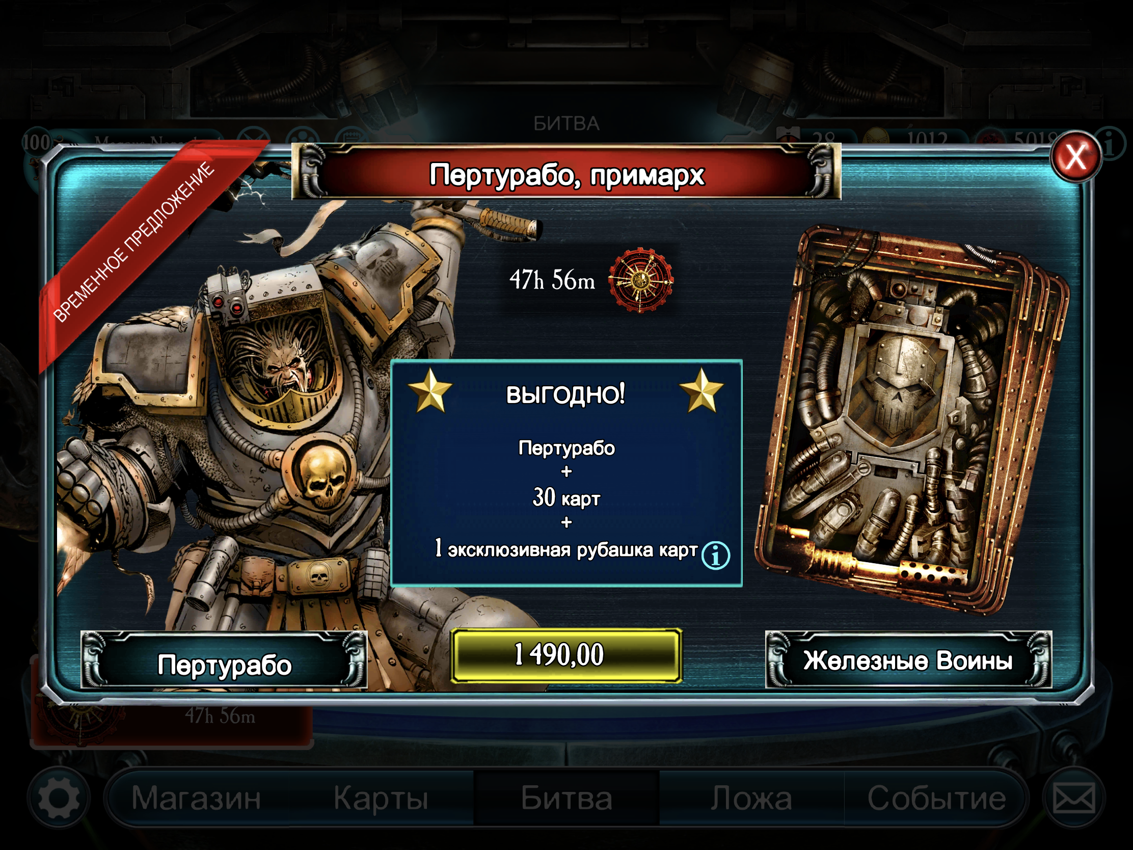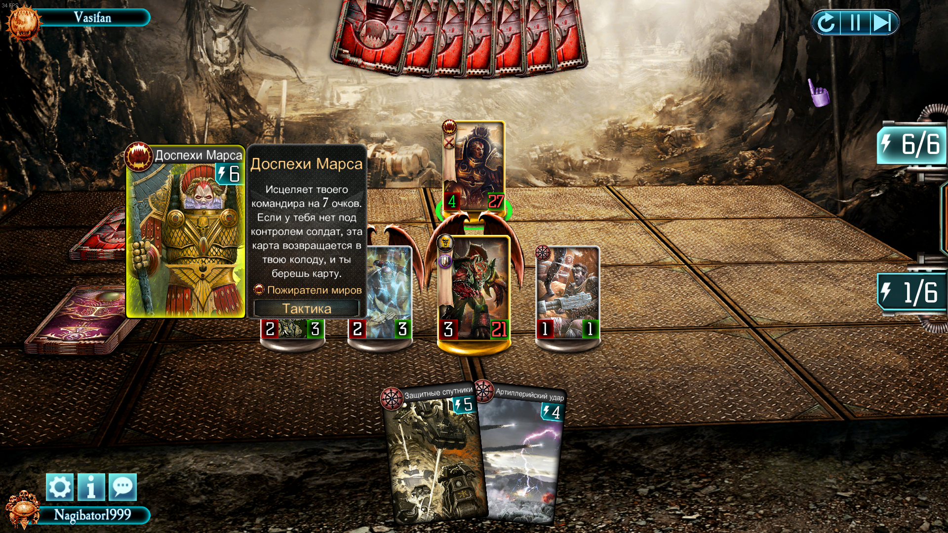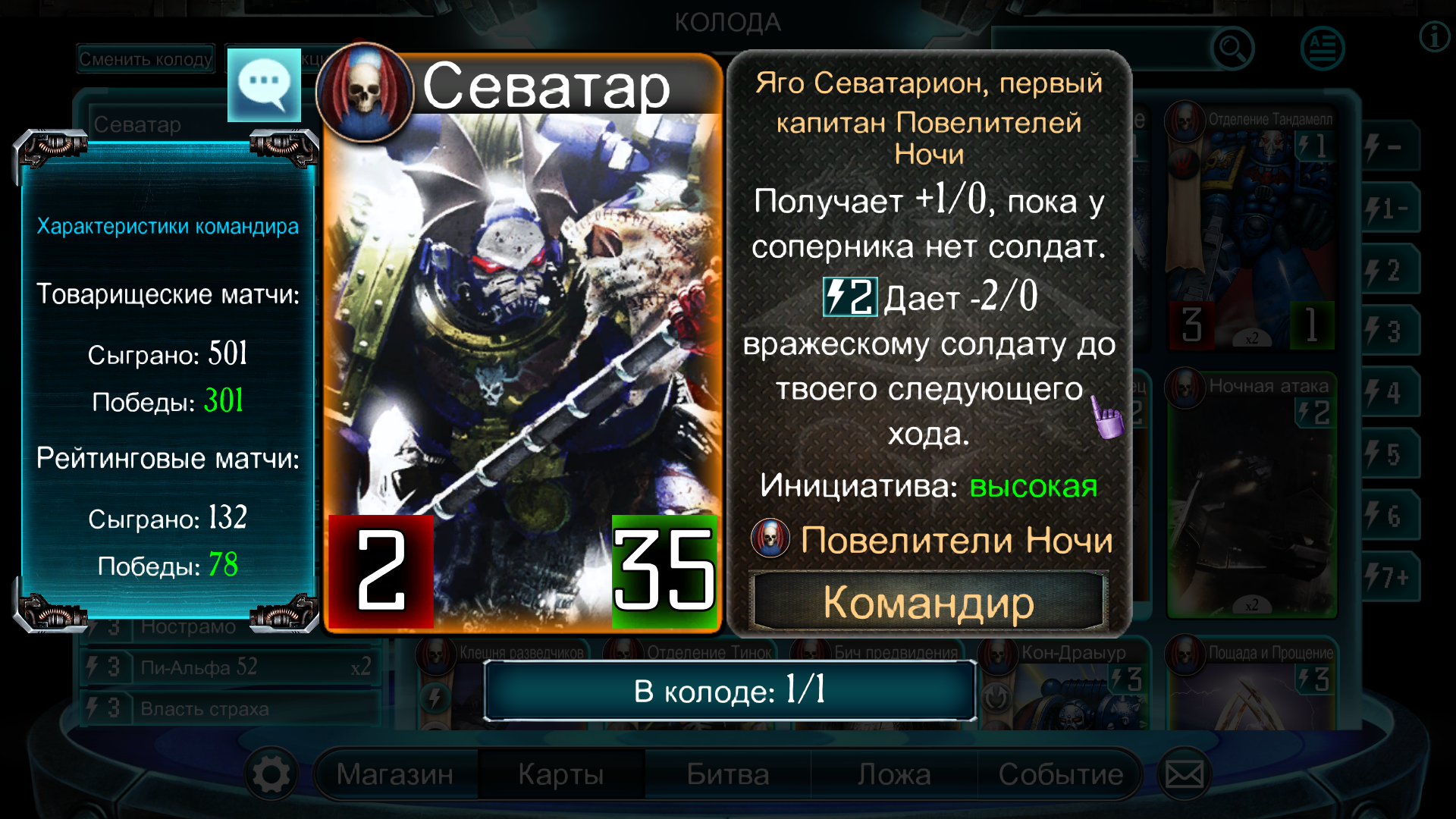 Ладно, дейлики откатал. Пошел в эвент - и скажу, колоды у Сани сосут. Три победы только сделал, два одинаковых сценария поражения: финишная прямая, у меня на руке две карты - БУРОВАЯ УСТАНОВКА, ВАУ, ЧТОБ Я БЕЗ НЕЕ ДЕЛАЛ, и... и... как думаете, что? Обход с фланга для солдат в руке!!! Охуенно, не правда ли? Если вам выпал Саня - только Черный Гнев, остальные колоды СОСУТ, причем не кровь. С сундуков все равно лега выпала, примарх. Мортарион, блядь. Я уже понял принцип их выпадения: игра смотрит, карт чьего легиона у меня меньше всего - и даёт их примарха, в прошлый раз выпал Вулкан.