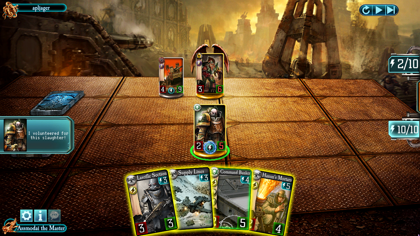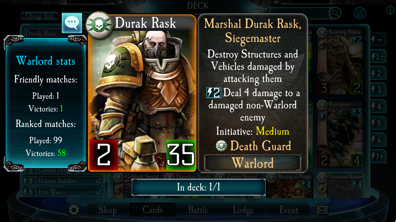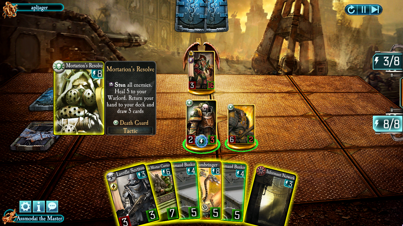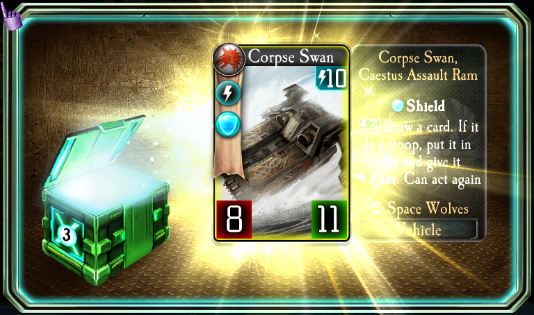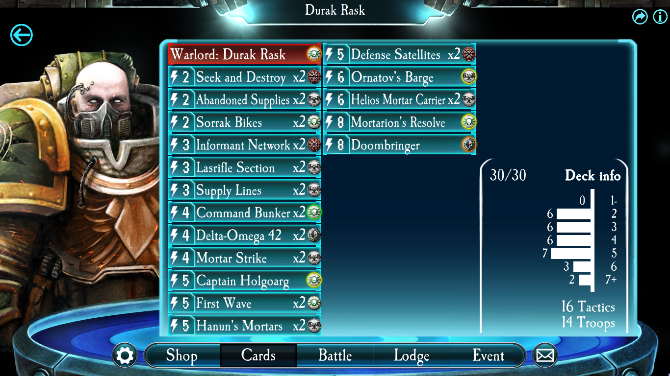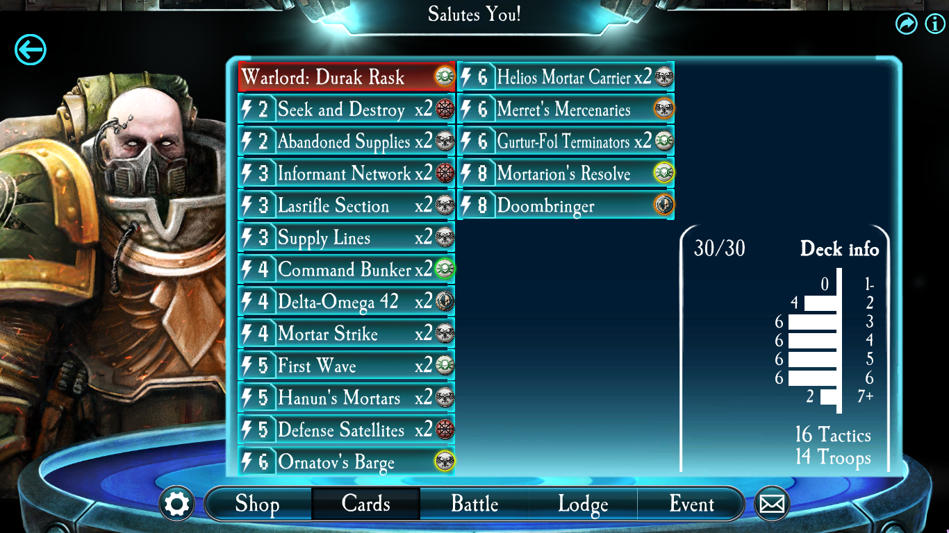 Ладно, дейлики откатал. Пошел в эвент - и скажу, колоды у Сани сосут. Три победы только сделал, два одинаковых сценария поражения: финишная прямая, у меня на руке две карты - БУРОВАЯ УСТАНОВКА, ВАУ, ЧТОБ Я БЕЗ НЕЕ ДЕЛАЛ, и... и... как думаете, что? Обход с фланга для солдат в руке!!! Охуенно, не правда ли? Если вам выпал Саня - только Черный Гнев, остальные колоды СОСУТ, причем не кровь. С сундуков все равно лега выпала, примарх. Мортарион, блядь. Я уже понял принцип их выпадения: игра смотрит, карт чьего легиона у меня меньше всего - и даёт их примарха, в прошлый раз выпал Вулкан.