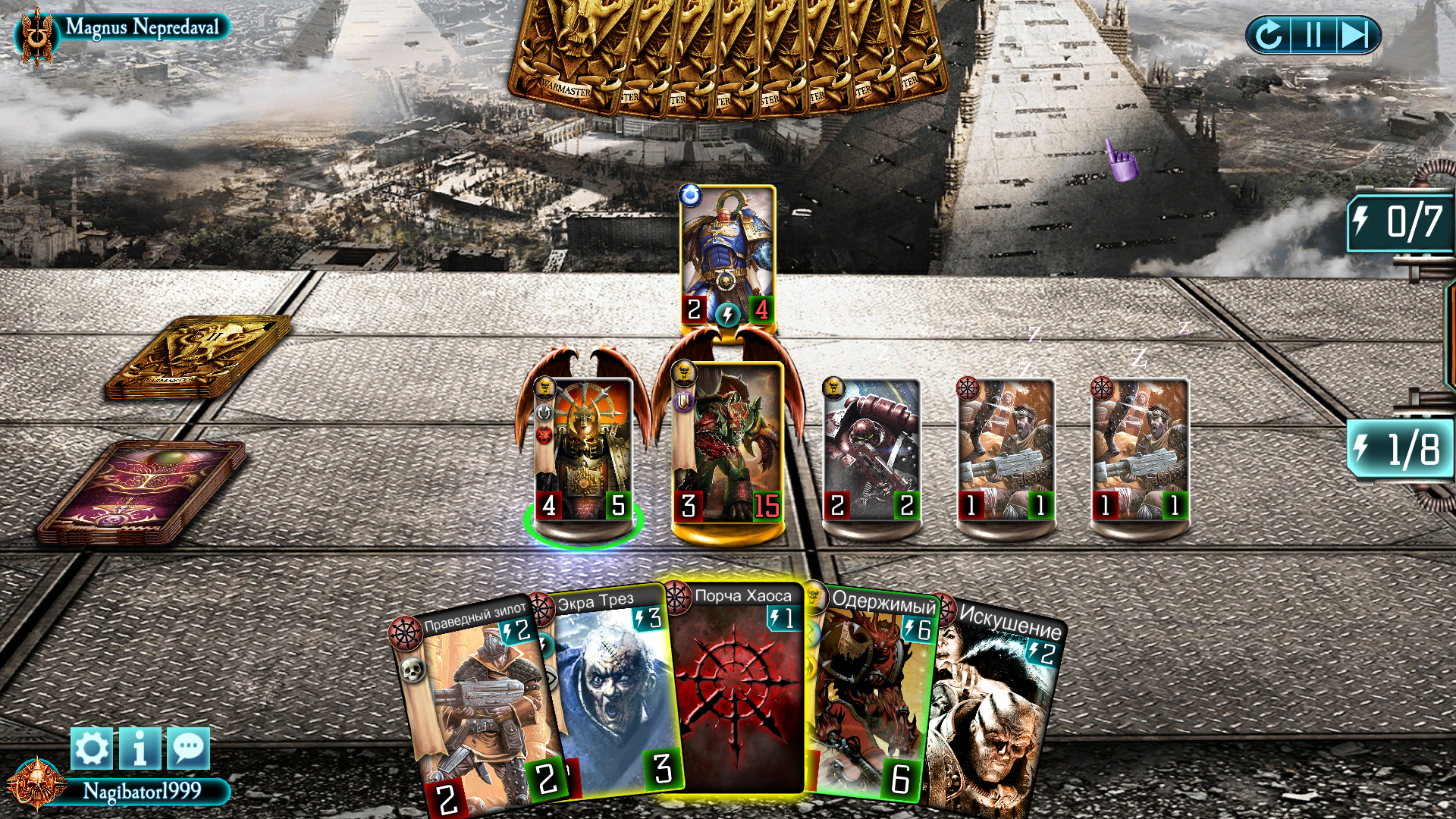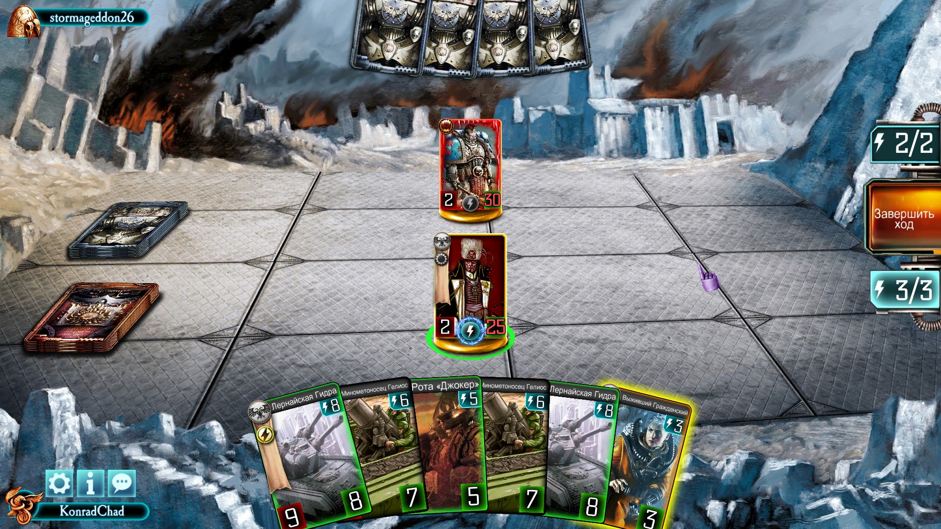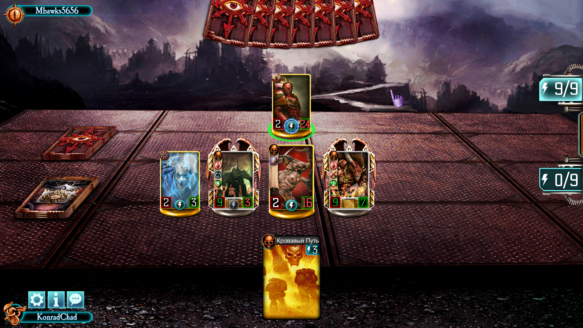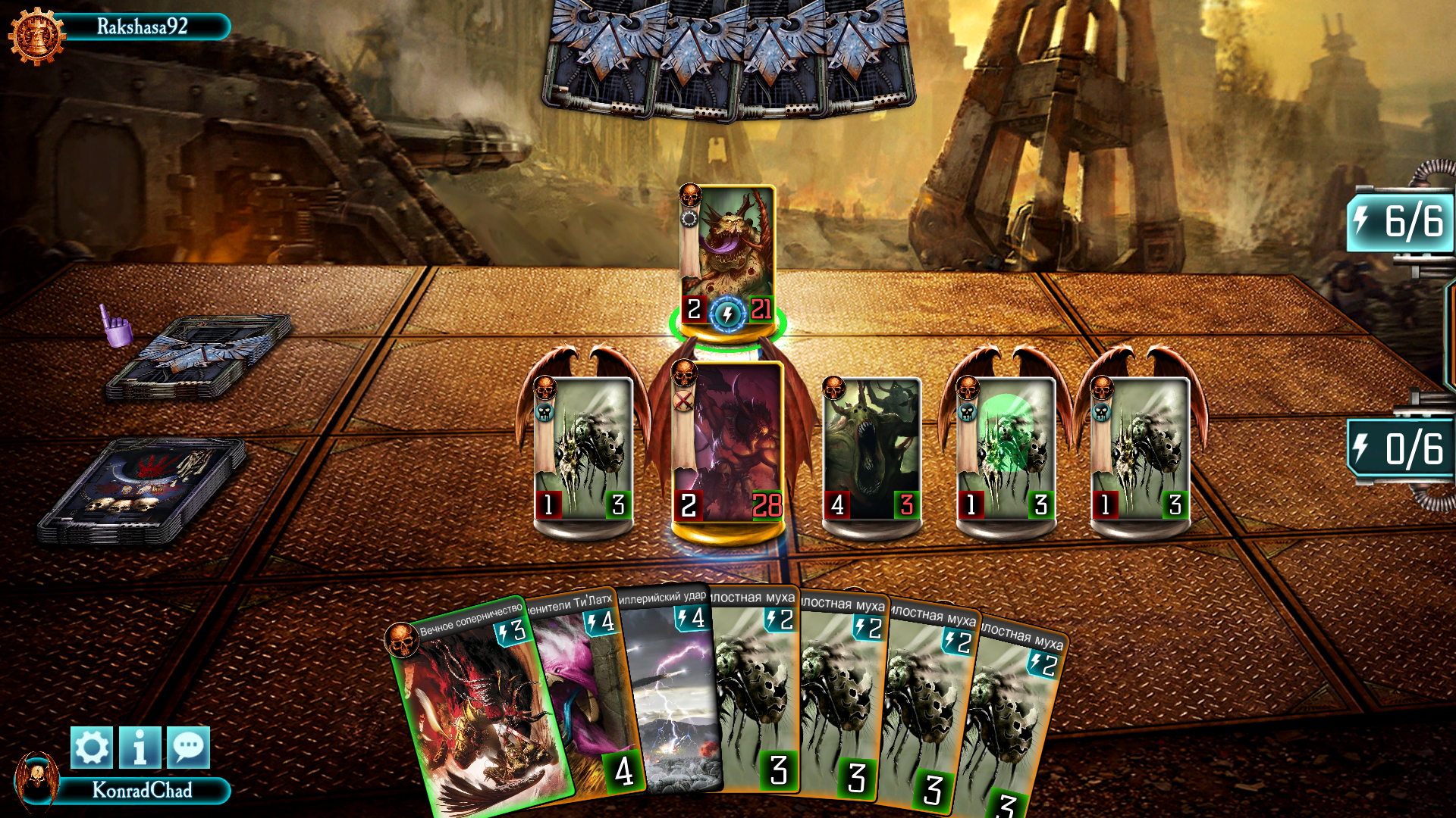 >У них есть прекрасная карта - стражи, но они и так в стелсе. А умбру кидают в связке с мор дейтаном на столе, чтобы 1+1, 6+1 и 6+1 кинуть. Но это до завоевателя отыгрывается. И умбра с морадусами или даже двумя в руке, и мор дейтан на столе, это супер-заход какой-то, ну или вагон промотанной колоды, что с Ангроном можно и не успеть. Суть в том, что Ангрону еще надо чистить стол противника, не чистит - ну что ж, дело их, я таких жабами убивал к 7 ходу. Вот ставит ворон 3/5, который приговор кидает - и что, игнорировать его? Нет, конечно, надо убить, но вулканы не осилят, да и стоит ли отдавать вулканы на одну цель да еще не в стелсе? Рывки тоже жалко, да и везде надо лицом добивать. В итоге ты выбрал Вулканы, Коракс потерял 3 хп и одну тушку, а ты 6 хп, если и дальше так пойдет - ворон вполне способен будет на летал из руки наскрести.