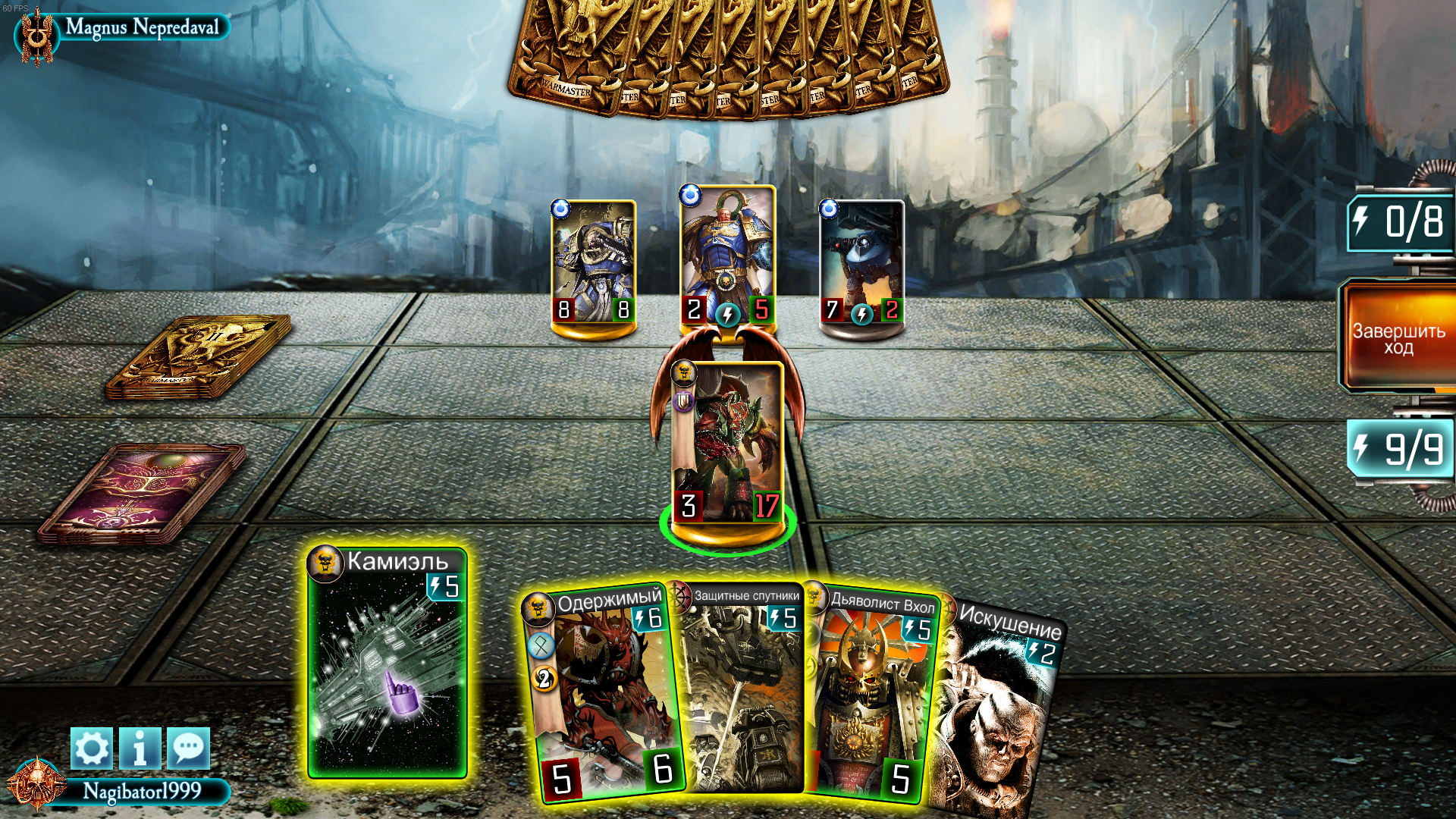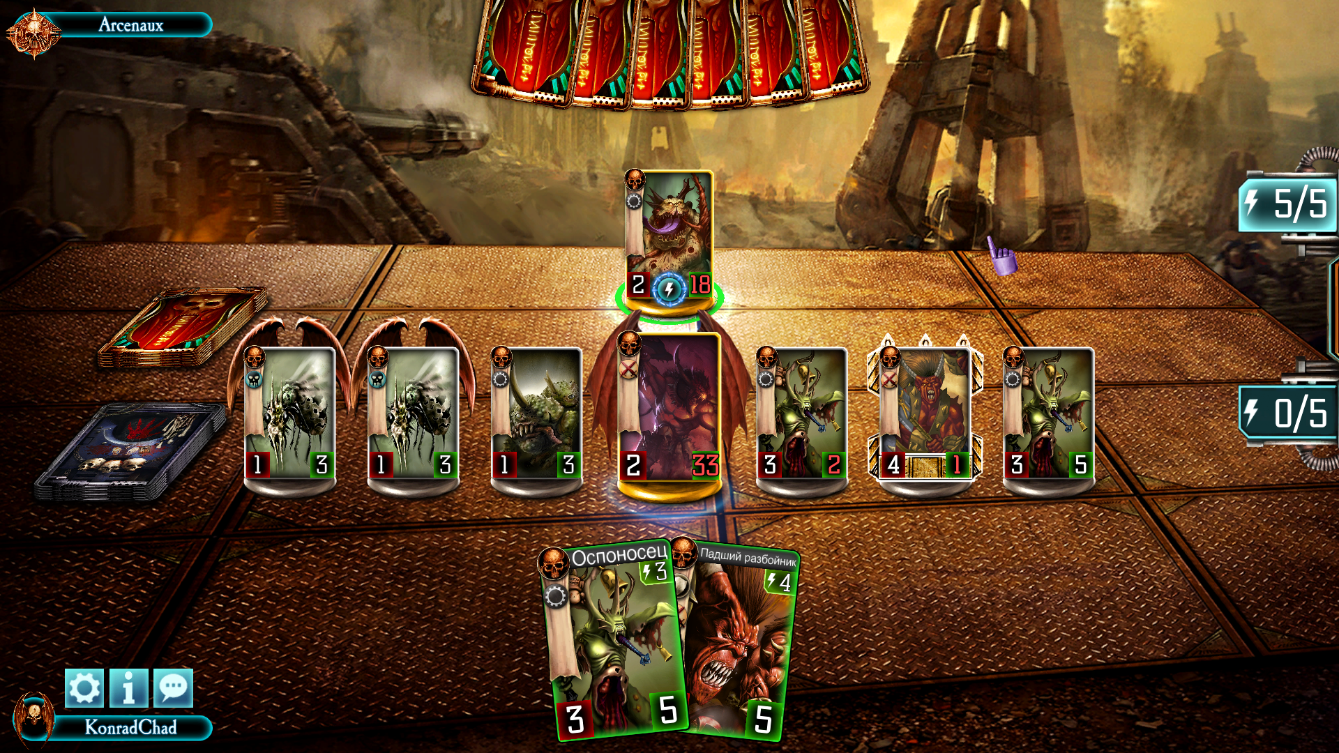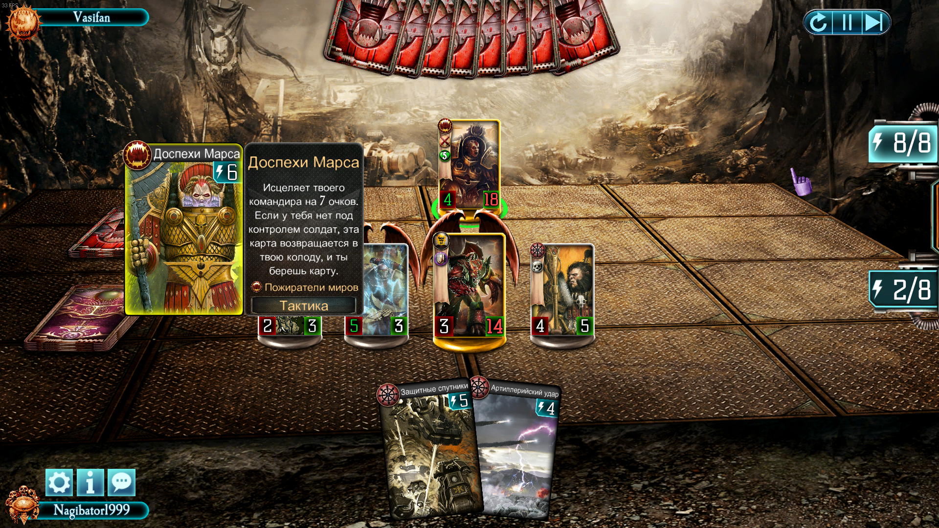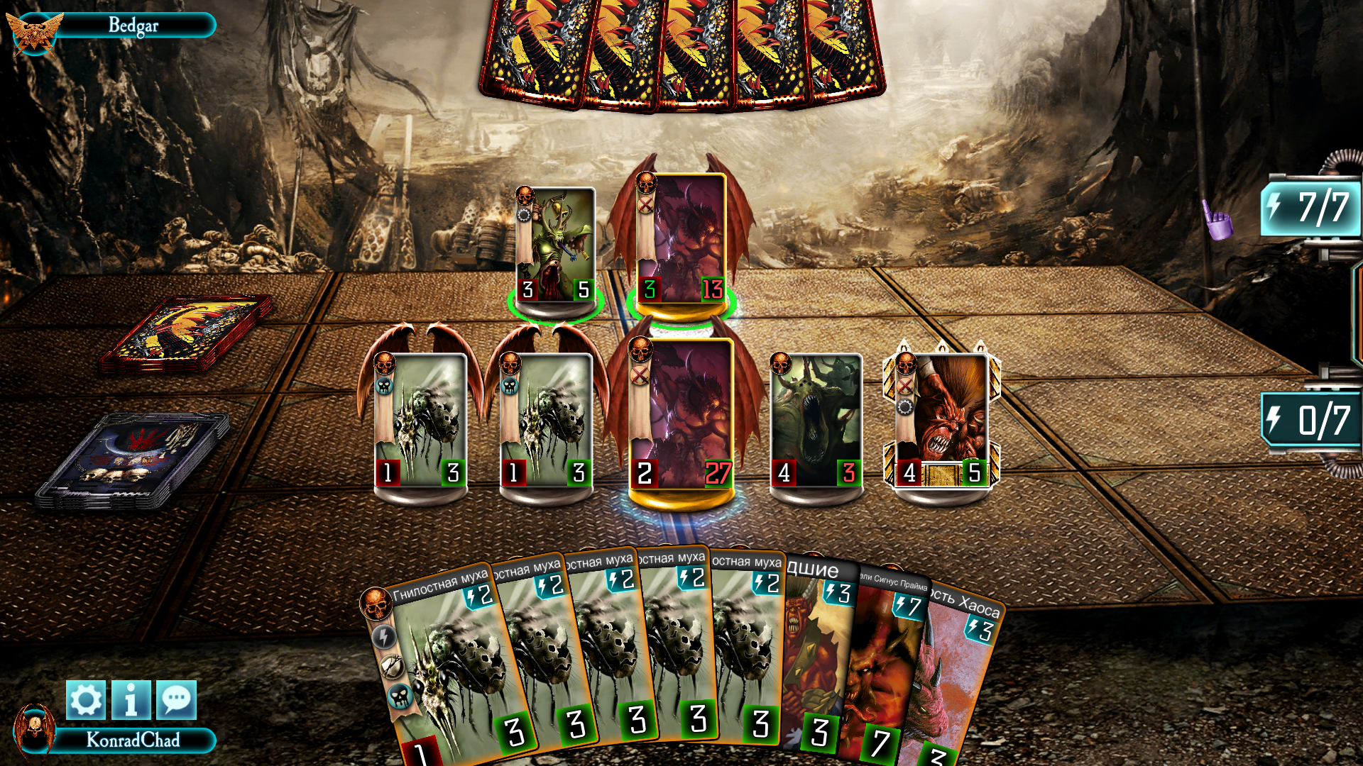 >У них есть прекрасная карта - стражи, но они и так в стелсе. А умбру кидают в связке с мор дейтаном на столе, чтобы 1+1, 6+1 и 6+1 кинуть. Но это до завоевателя отыгрывается. И умбра с морадусами или даже двумя в руке, и мор дейтан на столе, это супер-заход какой-то, ну или вагон промотанной колоды, что с Ангроном можно и не успеть. Суть в том, что Ангрону еще надо чистить стол противника, не чистит - ну что ж, дело их, я таких жабами убивал к 7 ходу. Вот ставит ворон 3/5, который приговор кидает - и что, игнорировать его? Нет, конечно, надо убить, но вулканы не осилят, да и стоит ли отдавать вулканы на одну цель да еще не в стелсе? Рывки тоже жалко, да и везде надо лицом добивать. В итоге ты выбрал Вулканы, Коракс потерял 3 хп и одну тушку, а ты 6 хп, если и дальше так пойдет - ворон вполне способен будет на летал из руки наскрести.
