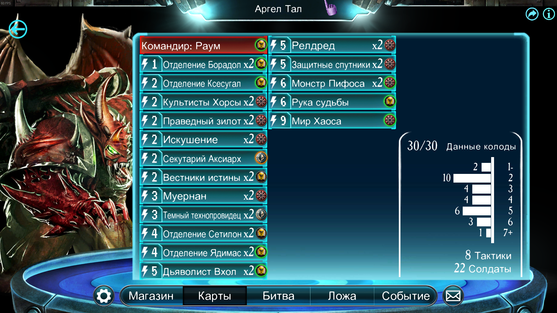 >>47693 Рарки - зеленые, оранжевые - эпики же. Тогда я не удивлен, Раум - сильнейший командир Несунов, он спокойно играет даже на турнирах против примархов, да и самые ходовые карты НС - в основном зелень или ногрейд: Отделение Ксесулал ака "матрешка"; разрыв в реальности; отделение Сеттилон, призывающее 2х пиздюков 2/2; отделение Ядимас; дьяволист Вхол, Камиель, Одержимый, Рука Судьбы, опционально Галлеки и Темное братство, да Меч Балтамира, из рарок разве что Круг Пепла и привлекает. Скомпануй по вкусу, закинь культистов хаоса, спутнички, по желанию - и иди, чисти. То есть скилл все равно нужен, конечно, я бы так не смог, но на Рауме это выглядит реально.