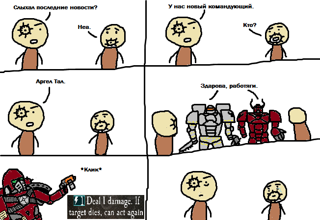 Ебать, посоны, что-то с игрой не так. Как обычно, сижу, горю, комментирую каждую ебанную ситуацию и каждый ебанный ход, например: "Сейчас Феррус хуйнет Тереков - и хуй мне, а не демонетки на 3 маны", или "Сейчас Лука в мою жабу стукнется ебалом и даст лазвинтовку", ну или "Сейчас Кхарн пинги Бронду накинает - и пиздарики мне" к слову, замечу, что Кхарн просто охуевший был, пинги идеальные, мой стол ими чистил на раз-два, но в тот раз я всё-таки задушил, слишком много мяса мне зашло - и ничего не сбывается! Сука, я даже Камиэли не могу предсказать, просто смотрю на стол "ага, у меня с норм здоровьем только 4/6, значит удар в него - Камиэль в него - и остальные пятеро с 2 хп умрут" - и нихуя! Нет Камиэля! Что-то тут серьезно не так. Только спутники - последний оплот стабильности, просто железное правило "если у меня на столе больше одного существа - урон по всем 3-4, не меньше".