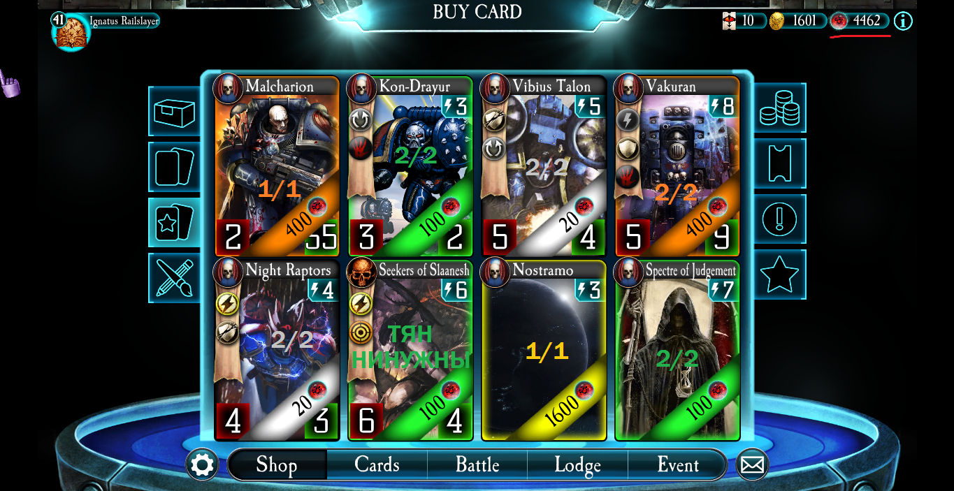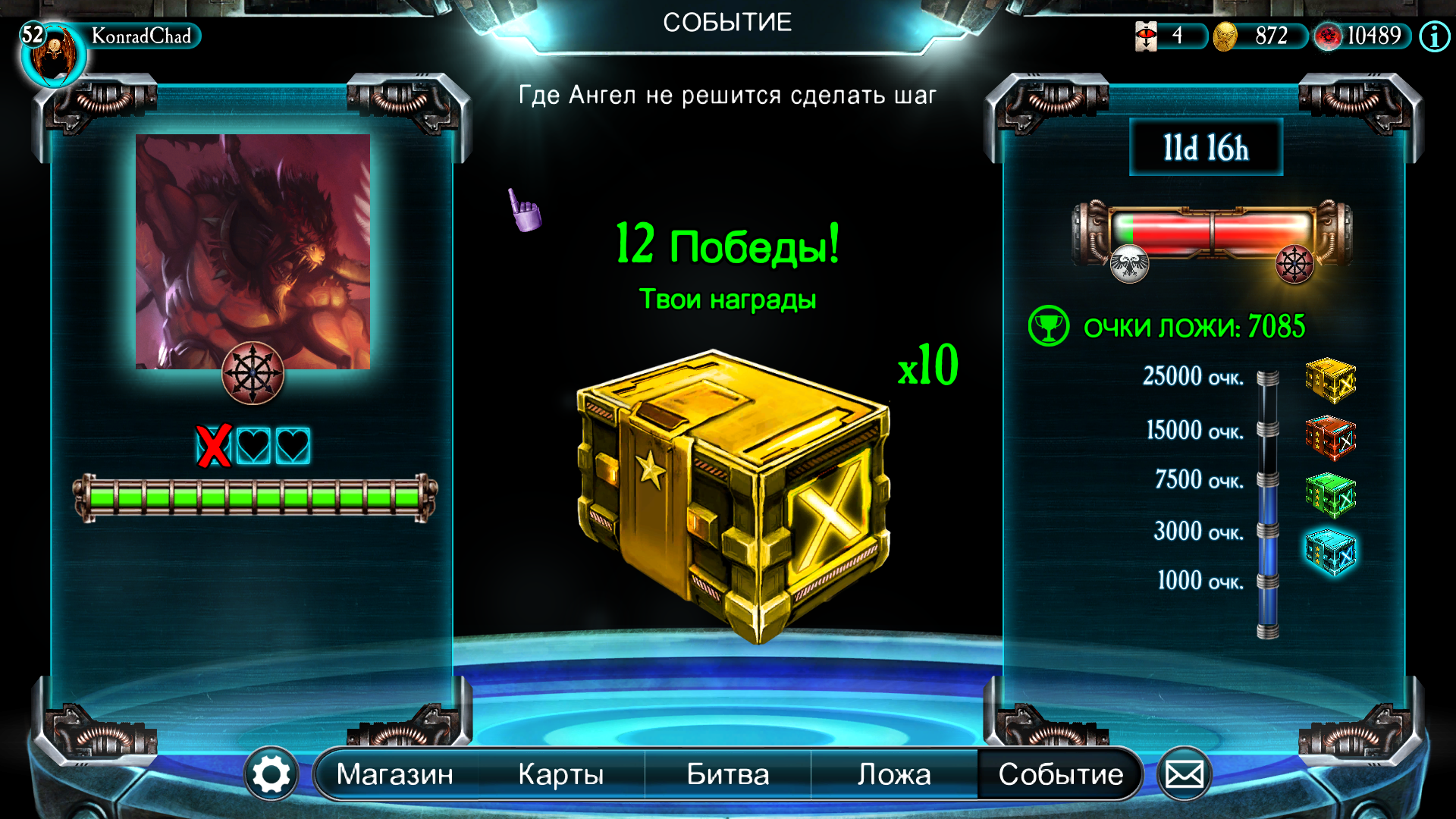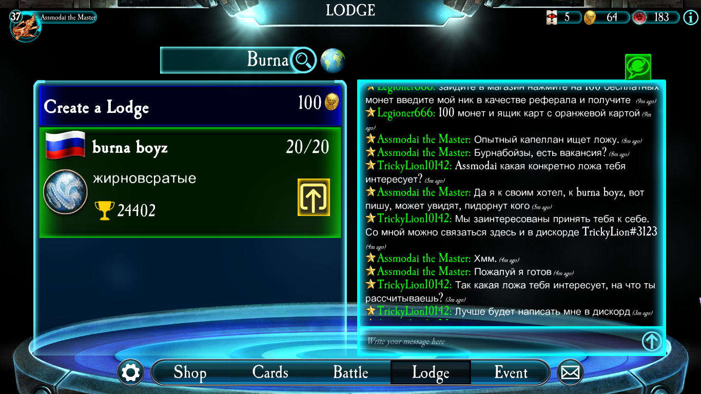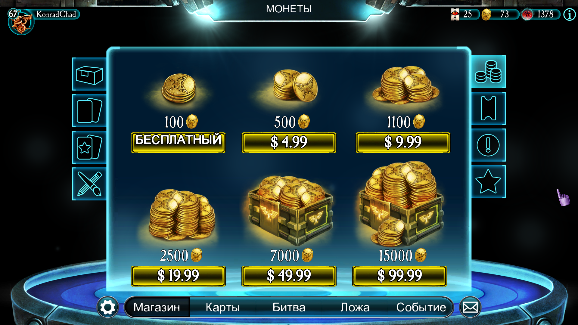 >>79558 Пройди обучалку, за неё дают сундуки, вроде даже с легой за последний. Потом в ложу вступай наша burna boyz, но выбирай сам, оттуда бери ник игрока, какой понравится - и в этой вкладке жамкай где "бесплатный" - там можно указать игрока, кто тебя пригласил, тебе вроде красный сундук дадут, а пригласившему 100 монет. Ну а дальше только бесплатные сундуки раз в 6 часов, сундук за 5 побед в день, сундук за дейлик, сундук за уровень - ну и в событиях за билеты можно получать сундуки, чем больше побед - больше сундуков, если ты в ложе - то в конце события получишь сундук, правда, если ты в нем участвовал, кажется. Если ты про покупку сундуков - на твой вкус, за реал монеты я б не рекомендовал брать, ибо дорого и рандом ебучий, если у тебя нет предпочтений, за какой легион играть, то лучше покупать стартовый сундук за 100 монет из первого расширения, потому что стартовая колода и так имеет карты Сынов Хоруса, Локен приемлимо и до 2500 рейтинга играет, падают карты 4-х фракций, из которых Сыны Хоруса и Пожиратели Миров вполне себе играют даже без легендарных карт, просто послабее.