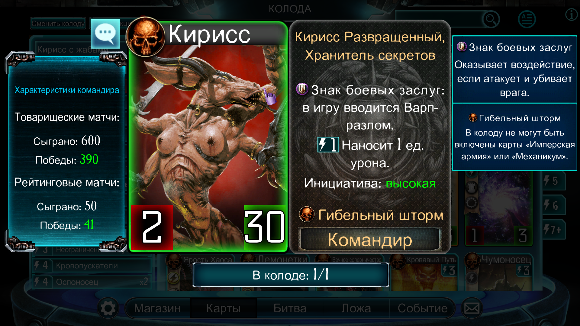 >>79664 Да командиров немало идет, их в игре более 50 вроде, нет смысла смотреть на первого выпавшего и на него карты собирать. Ну, если это не примарх, например, вроде Коракса, тогда да. Недельку-другую поиграй, посмотри, кто из противников тебе наиболее интересный для тебя геймплей покажет - ну и если он выпадет, попробуй на нём.