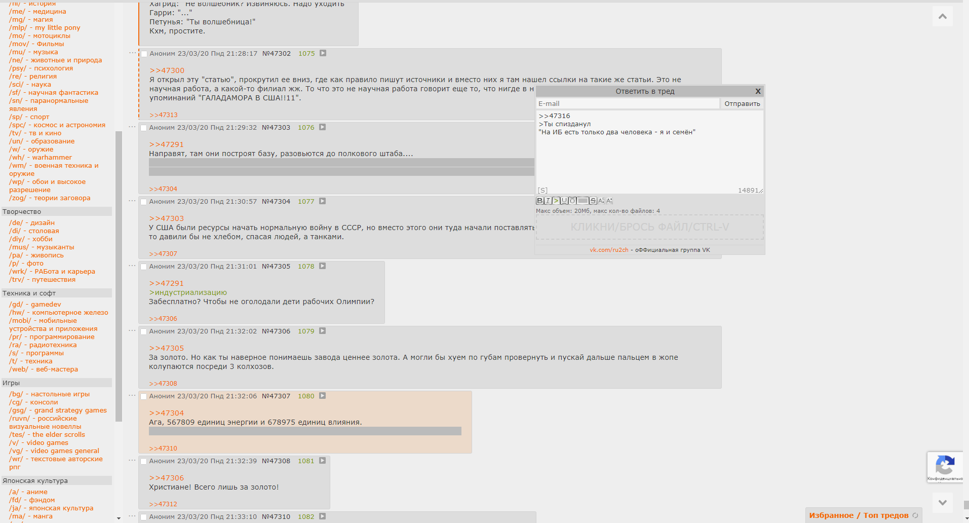 >>45910 >>45912 А кто еще поддерживал Магнуса, напомните? Саня, Хан, еще кто-то вроде был. >>45911 И самое парадоксальное - становятся неуязвимы, пропустив весь этот ад через себя, во всех смыслах этого слова. Тех, кто не выдержал, просто убивают. ТС такое в самых мокрых снах не снилось. >>45922 Я именно про манеру общения, а не любовь к эльдарам, так-то ксенофилов и без него хватает. У него разговор специфичный, который когда-то показался мне забавным и я решил пообщаться поближе. >на меня тоже кидаться надо? Нет. >Но если ты уходил с доски, ты не видел что тут творилось в первых тредах. Это можно просмотреть, если залезть в старые треды, полез тут в поисках паст и увидел псевдоКёрза - вот реально человеку делать нехуй. То, что ты говоришь - вообще пиздец какой-то, и это реально надо ЗАКАНЧИВАТЬ. Двач - АИБ, за неймфажеством вне ролевок - на другие ресурсы.