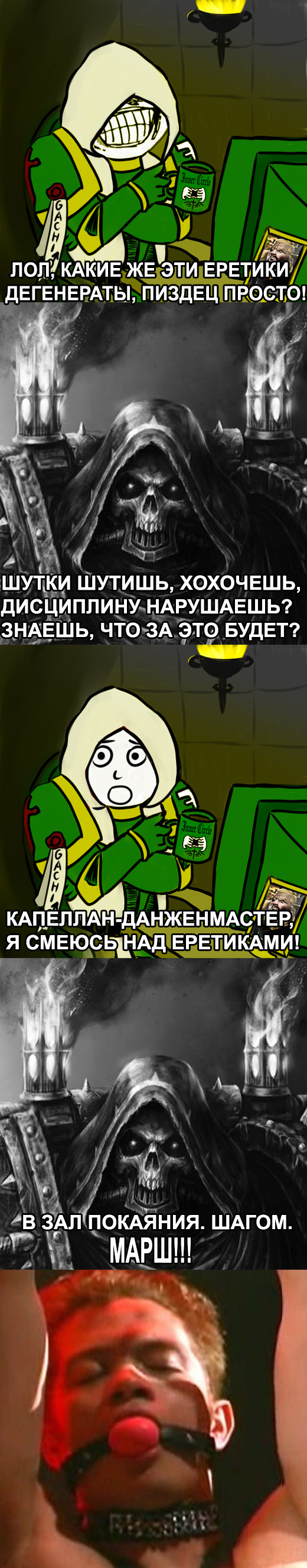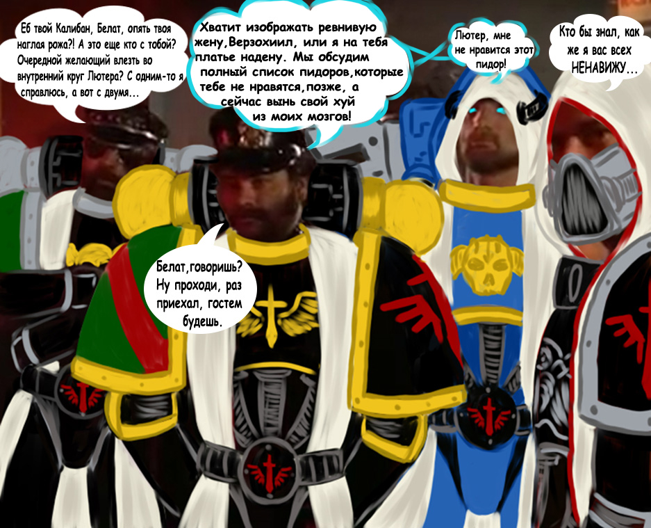 - Эй, дружок-пирожок,мне кажется ты ошибся Сегментумом. Око Ужаса два варп-прыжка вниз. - ЗА ИМПЕРАТОРА! - Ах, воюй за свой труп на троне сам, лоялист. Может быть мне стоит десантироваться к тебе на корабль и показать кто тут настоящий Бог-Император? - Хе, да? Я надеру твою задницу своим силовым кулаком. - Ха! Ну давай, поехали! Почему бы тебе не снять свою силовую броню? Я сниму свою и мы сразимся прямо здесь, на корабле! - Да, никаких проблем, еретик! - Полюбому. Снимай эту... мм... консервнобаночную силовую броню. - Я тебе покажу кто тут Император этого человечества.