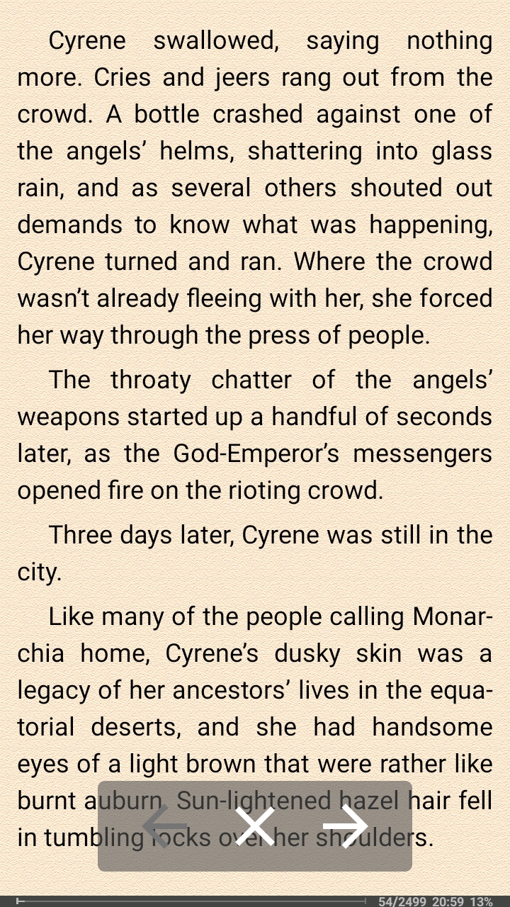 Cyrene’s dusky skin was a legacy of her ancestors’ lives in the equatorial deserts, and she had handsome eyes of a light brown that were rather like burnt auburn. Sun-lightened hazel hair fell in tumbling locks over her shoulders. At least, her more infatuated lovers described her in such terms.