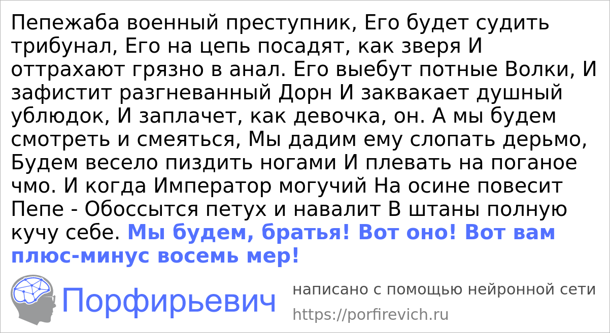 >>50822 Шизло, ты хоть на что-нибудь, кроме "попка дурак" способен, или скоро слюни пустишь? >>50823 >обычный одержимый Несущий Слово >обычный одержимый Несущий Слово >обычный одержимый Несущий Слово >обычный >одержимый >Несущий Слово В этой фразе прекрасно все. Что, собрата по бесовской пляске увидел, обычный одержимый швайнокуколд?