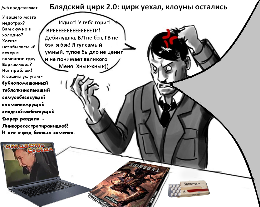 >>50752 Идут по дороге Мортарион, Хорус и Фулгрим. Фулгрим ползет. Мортарион: я самый обиженный. Хорус: я самый тупой. Фуля: в мою верзоху можно запихнуть абсолютно все. Видят - дом правды. Заходят. Мортарион выбегает, злится: я не самый обиженный, хуже меня Попосрато! Хорус выбегает, ногами топает: я думал, тупее меня нет, а ведь есть еще Магнус! Фулгрим вылетает в бешенстве, слюна брызжет, висящий на груше хвост отвалился, волосы на себе рвет, и орет диким голосом: ДА КТО ТАКАЯ ЭТА КИРЕНА ВАЛАНТИОН?!!