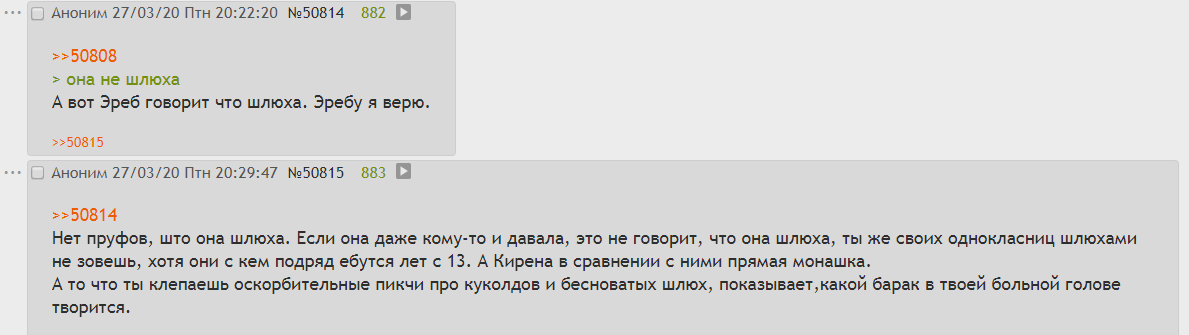 >>50814 Нет пруфов, што она шлюха. Если она даже кому-то и давала, это не говорит, что она шлюха, ты же своих однокласниц шлюхами не зовешь, хотя они с кем подряд ебутся лет с 13. А Кирена в сравнении с ними прямая монашка. А то что ты клепаешь оскорбительные пикчи про куколдов и бесноватых шлюх, показывает,какой барак в твоей больной голове творится.
