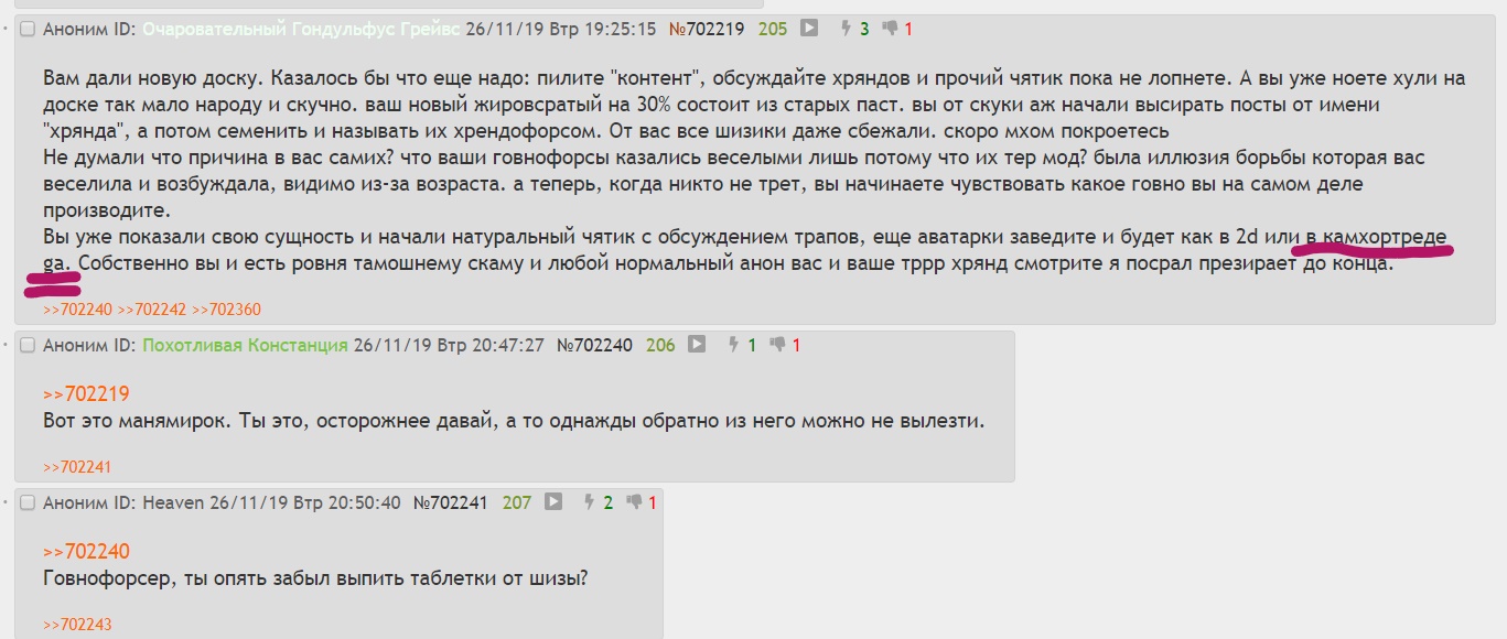 >>113582 Так то оно конечно подгорало когда раздел в помойку превратился, в каждом треде только шизопосты с мастями, на любовь анона набрасывались за любой пост с обвинении в магнусе или любой другой херне, когда спустя парумнсяцев такой свободы раздел опустел и постинг везде кроме шизотреда остановился, и начались таки действия. Потом уже выяснилось что в бреде забанили вахатред и он перекатился в закреплённый, что контингент бредотреда не очень различал вчастности бред и ваху. Ну и по итогу, так как этот контингент больше неохотном видеть ни в вх ни в бреде, и был создан этот раздел, как компромиссный вариант. Например можно вспомнить один из тематических банеров который попросил запилить, для так сказать раскрытия сути происходящего.