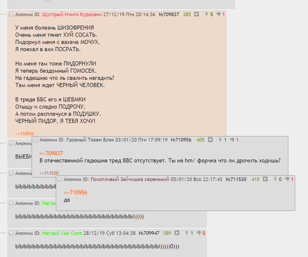 >>133907 На Вахаче однажды жирновсратыши всех окончательно доебали, админобоярин на вахтёре перебанил весь костяк шизов и они ушли сюда. Поначалу в Нихилаче срали как не в себя, почуяв волю, но потом говно сожрало само себя, щитпостинг одних шизов стал затмевать щитпостинг других, доска преисполнилась и часть жирновсратухов захлебнулась. Такие дела.