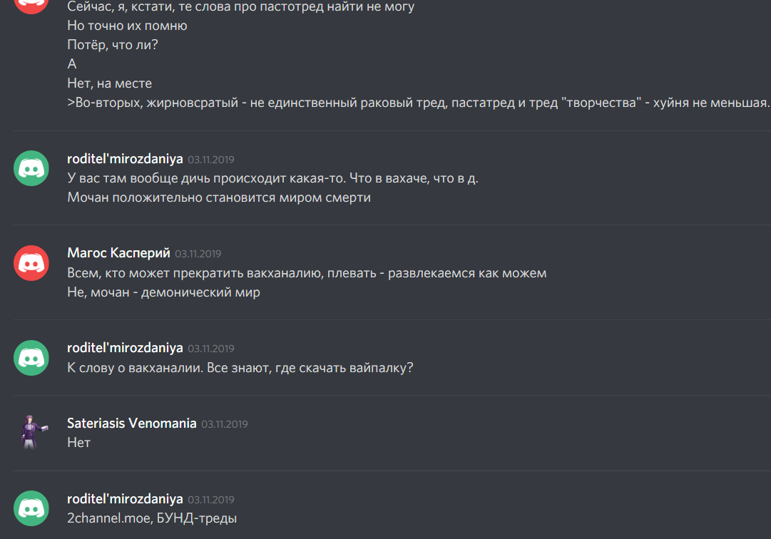 Касательно конфы. Ее создали (03.11.19) после того, как потерли ЖВТ (31.10.19). Чтобы пострадавшие от ковровых банов и сочувствующие по-прежнему могли утолщенно и неэстетично обсуждать ваху. Пруф - первые две картинки. Единственное предложение вайпа отвергли. Никому не хотелось иметь неоспоримую и законную причину для бана. К тому же, это было бы мерзко и подло по отношению к вахачерам, не принимавшим участия в скандале из-за ЖВТ. Пруф - вторые две картинки. Обсуждение в конфе умерло, как только появилась эта доска. Ни одно обвинение в вайпе не имеет под собой никаких доказательств, кроме прикрепленных выше скринов. В то же время, есть сомнительной достоверности информация о намерениях модера вахача вайпать нашу доску вместе с друзьями, а также неоспоримые пруфы вайпа нашей доски как минимум ЗВ-пикчами.