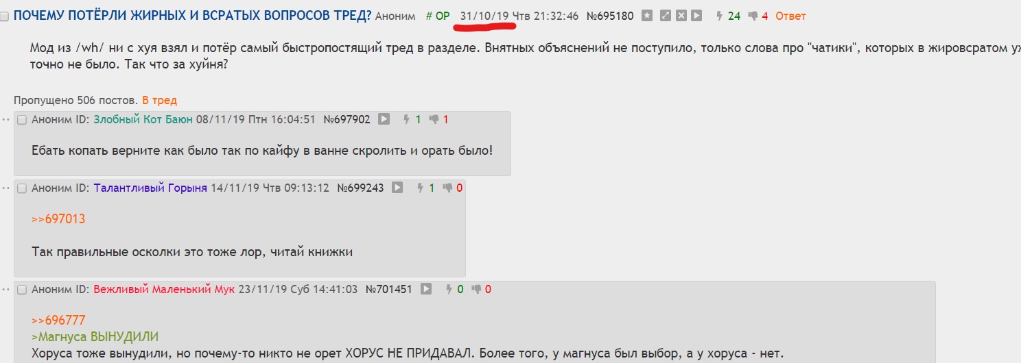 >>113010 Ты спроси нормальных анонов. Все скажут что жирный тред протух где то в районе топоров для эльдар. Дальше был сплошной тролекоастер и залевание раздела не свежим жиром. Аноны из за этого уходили. По сути жирный тред убивал раздел. Стал рассадником еретиков хаоситов. Модератор как арбитр выжег зараженную ячейку подулья Но я вижу тебе объяснять что-то бессмысленно, ты будешь твердить свои мантры думая что они кого то обидят. Интересно когда вхн удалят где ты срать будешь?