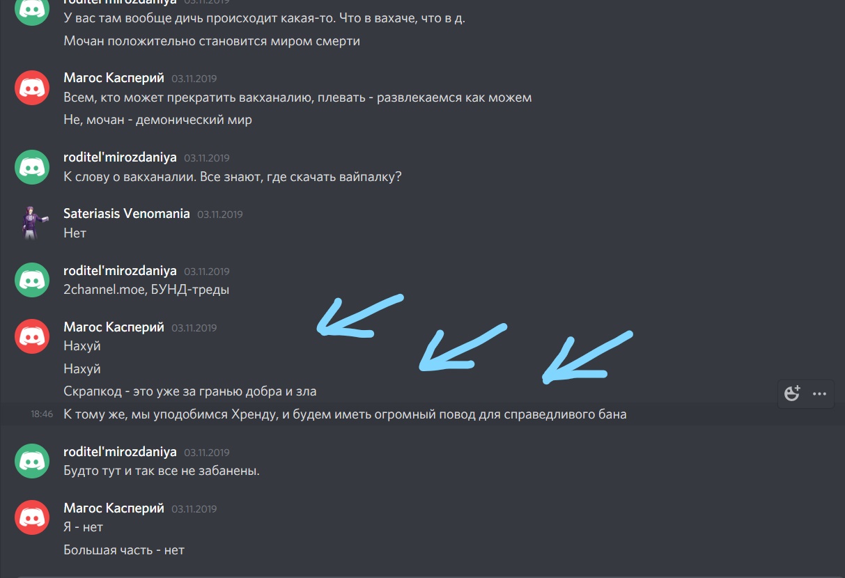 >неизвестной конфы Конфа доминатус мужебратья! Уже под кроватью сыны легиона, апельсинам спасения нет. А если серьезно то т.н. "конфа" это беспруфный взвизг Авокаддона, Хренда и их протыкласников. А до воцарения Аввокадона аме было хорошо, и ни шизики, ни гомофорсы, ни срачи, ни дивнота, никого особо не парили, мод сносил вайпы и сильное бурление и все было ок, жир оч редко выплескивался за пределы всратого и до декабря 19 го была иддилия.