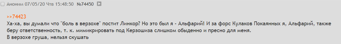 И еще одно ебанько, которое и устроило этот цирк со вбросом так называемых "кулаков покаянных", чтобы мы тут перегрызли друг друга. Форс, которым теперь вайпают ЖВТ. https://2ch.hk/whn/res/74349.html#74450