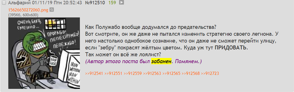 >>113016 Жопошник это старая паста, ты тогда пешком под стол ходил когда ее создали. Она хорошо описывает мудачество лемана срусса. Она в каком то смысле бекова. Куколдун это попоболь обиженных сруссодетишек. Им обидно, что их фурри примарха жопошником зовут, еще обидней что это правда и бек. Они придумывают обидные не бековые обзывалки. Так как обзывалки тупые, то никто кроме срусожопых на них не реагирует. Тогда они засерают куколдунами весь вх. А это вайп. Понятно объяснил?