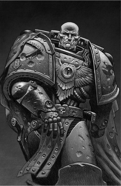 "...На каменном полу, хватая воздух ртом, лежал Рогал Дорн. Его одежда была покрыта кровью, на теле зияли открытые раны. А на теле огромного воина сидела, похожая на белую горгулью, фигура Ночного Призрака, бледного, как ночь, и тело его было покрыто каплями пота. Он тоже тяжело дышал, и спутанные волосы его упали на адски черные глаза, когда он повернулся к нам. Он плакал, но в то же время угрожающий рык срывался с его губ; черты его лица были искажены в равной степени, как ненавистью, так и чувством вины".