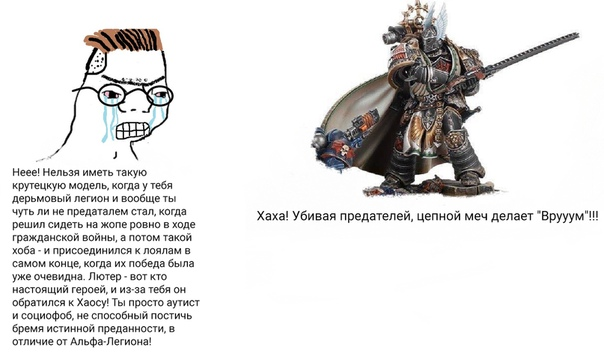 У лоялов только один явный неадекват был - Феррус. А у какоситов - целый зоопарк. Единственный из них кто хоть как-то понимали в стратегическом планировании - Хорус и Альфарий Омегон. Остальные - буйные шизоиды, обиженки и просто дебилы.