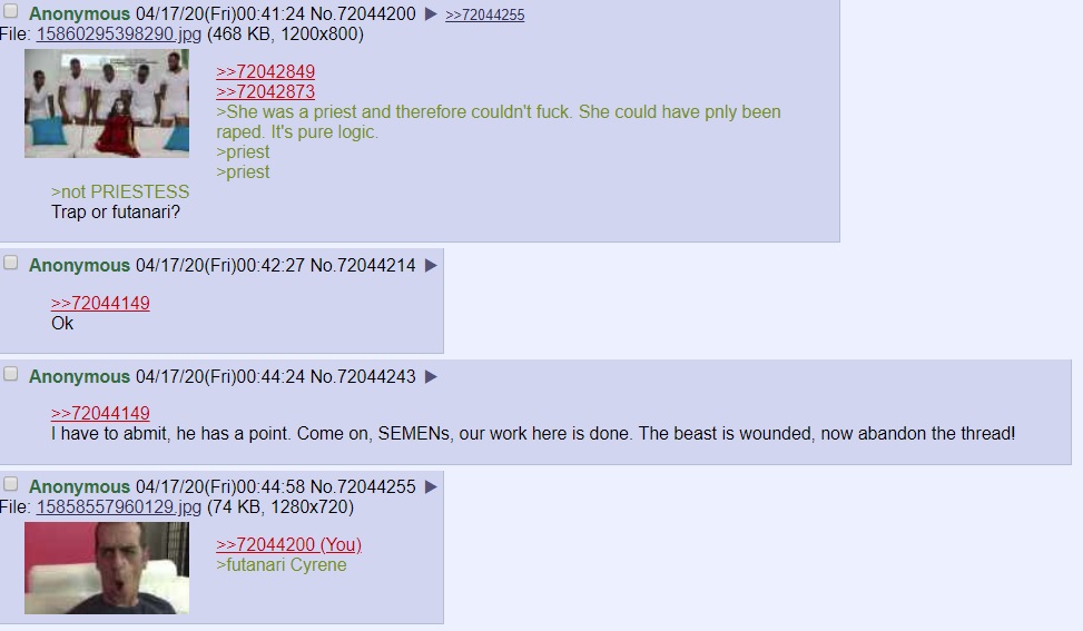 >>61749 >She was a priest and therefore couldn't fuck. She could have pnly been raped. It's pure logic. >priest >priest >не PRIESTESS Вот это обсер так обсер, у Кирены-то хуй, а мы и не знали.