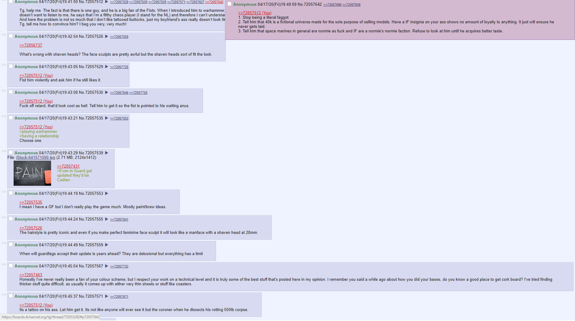 >>62460 1. Stop being a literal faggot. 2. Tell him that 40k is a fictional universe made for the sole purpose of selling models. Have a IF insignia on your ass shows no amount of loyalty to anything. It just will ensure he never gets laid. 3. Tell him that space marines in general are normie as fuck and IF are a normie's normie faction. Refuse to look at him until he acquires better taste.