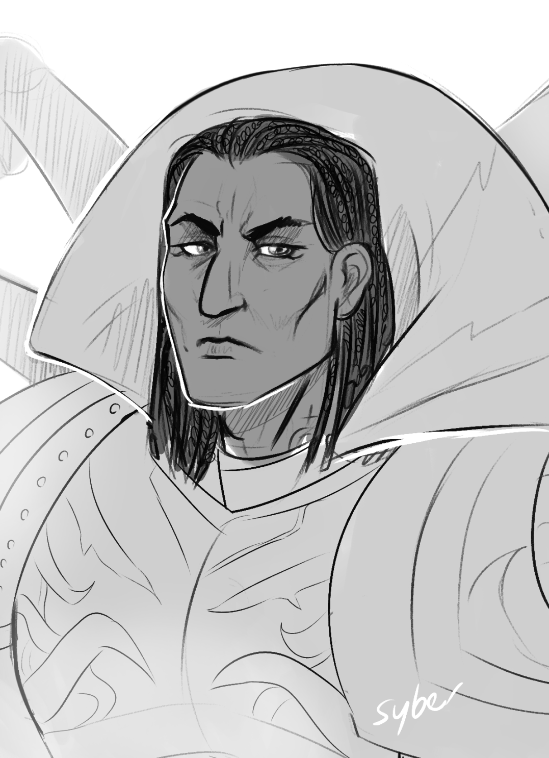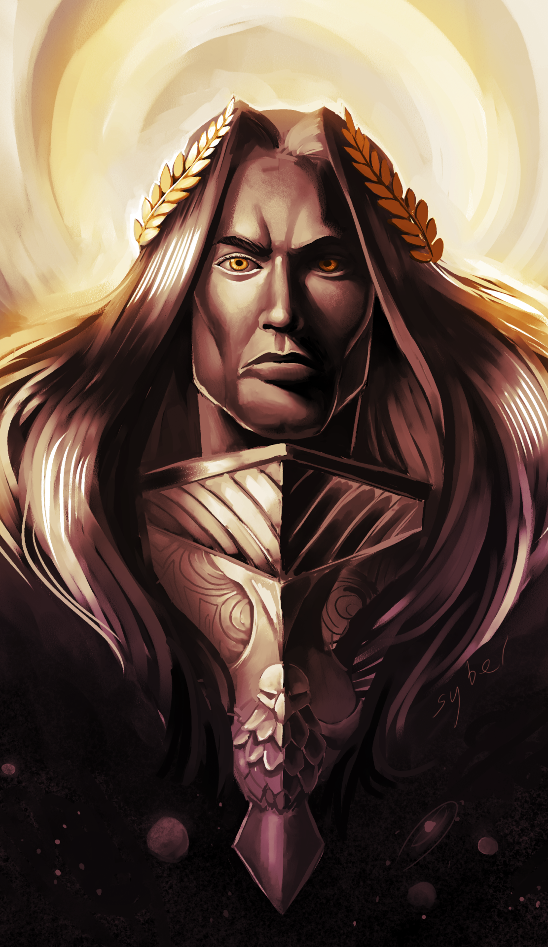 По бокам на голове у предводителя торчали, загибаясь вперёд, внушительные рога, испачканные засохшей кровью. Его доспехи были выкованы в виде выпуклых костей. Металлические кости обручами огибали бёдра. Кости, приваренные к костям, образовывали рунические рисунки. Ухмыляющиеся чужацкие черепа закрывали колени. Гигантские кости пальцев покрывали сапоги и перчатки. Выпирал похабный гульфик из искусственной кости, инкрустированный гематитами, изображая язвы. Ещё на нём были тонкая атласная накидка, которая ярко трепетала на ветру, и золотое ожерелье с эротическим амулетом. От человека-быка исходила пугающая звериная чувственность. Его облачение как бы говорило, что даже кости способны совокупляться, даже металл может быть распутным... правда, без особых нежностей.