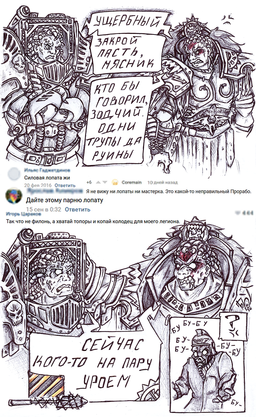 >>70002 Хотел я как-то фанфик запилить. По мотивам историй про Кхарна и Ангрона. Феррус-то тоже буйным был, а изредка и мудаком немалым. А Мора он не любил за этот его...прагматизм, "цель оправдывает средства". И вот, собственно, сюжет: Феррус и Мор, тет-а-тет, некий момент, середина беседы. И Мор в своей голове начинает понимать, что или он прямо сейчас сдаёт назад, или живым уже он отсюда не выйдет. Но Мор не сдаёт назад. Наоборот, он включает не меньшего мудака, сосредоточенного и ожесточённого. Ещё разговор, ещё несколько фраз, и вот уже Мор внутренне наслаждается (с горечью) тем, как славно он своей упёртостью (упоротостью) довёл ситуацию уже почти до окончательного итога, и "теперь уж точно всё". В ту же секунду Феррус звереет, холодность его раскалывается, он налитыми глазами вперивается в Мора и сдавленно выговаривает что-то вроде "Д-ДОВОЛЬНО СЛОВ!". И тут Мор к своему же удивлению делает абсолютно нерациональный поступок - звереет в ответ и первым нападает на примарха. Да так хорошо что громовым молотом выламывает Горгону челюсть Феррус удара не видел, ему в этот момент как раз и сносило крышу. Примарх припадает на колено, повисает пауза, Феррус хрипит, выплёвывает ошмётки на пол, а потом жуткий хруст вправляемого сустава и безумный долгий хриплый смех, что твой Русс на Дулане. Мор в итоге выживает, без гнева смотрит на него примарх. Без гнева и с уважением, насколько это возможно. Но никто кроме них двоих эту историю не узнает. ЖР-анон