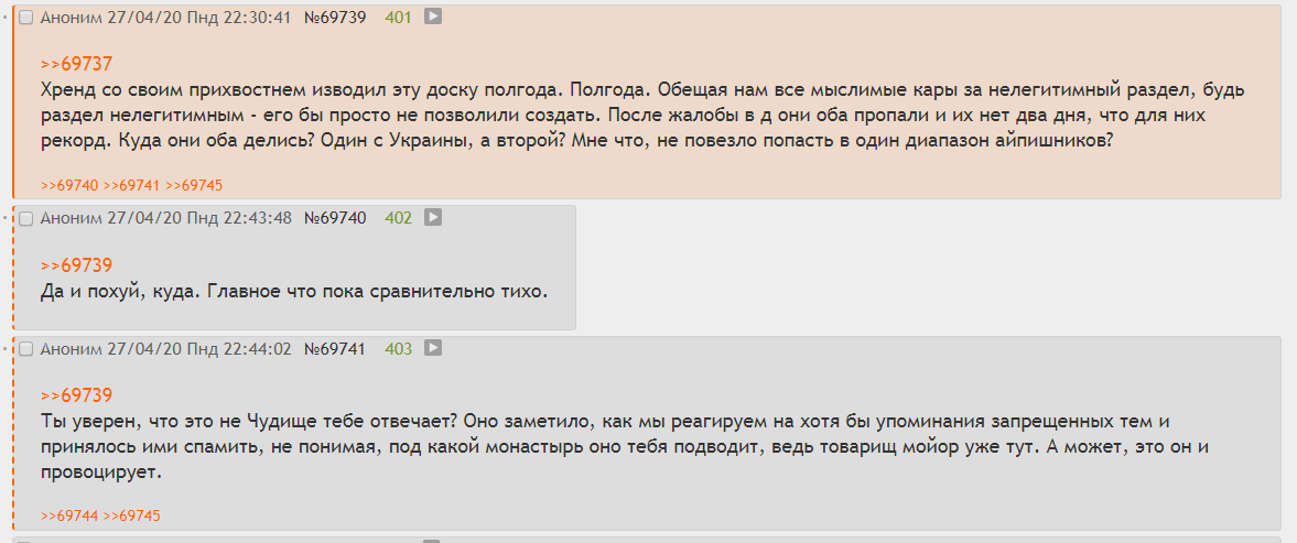 — Двач, двач! Мне так больно, у меня кровь течет! За что мне это? — Чем суп ел, дебилушка? — Ножом, конечно. — А ложку не пробовал взять? — Почему анонимусы так безжалостны ко мне, а еще двач-помогач?! Это невыносимо! — Ложку взять не пробовал? — Нет! — А что тебе помешало? — Я не хочу об этом говорить. Всё. Тред закрыт. САЖИ ТРЕДУ САЖИ. Вайп!