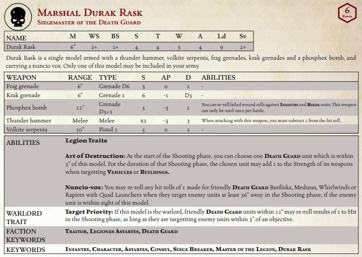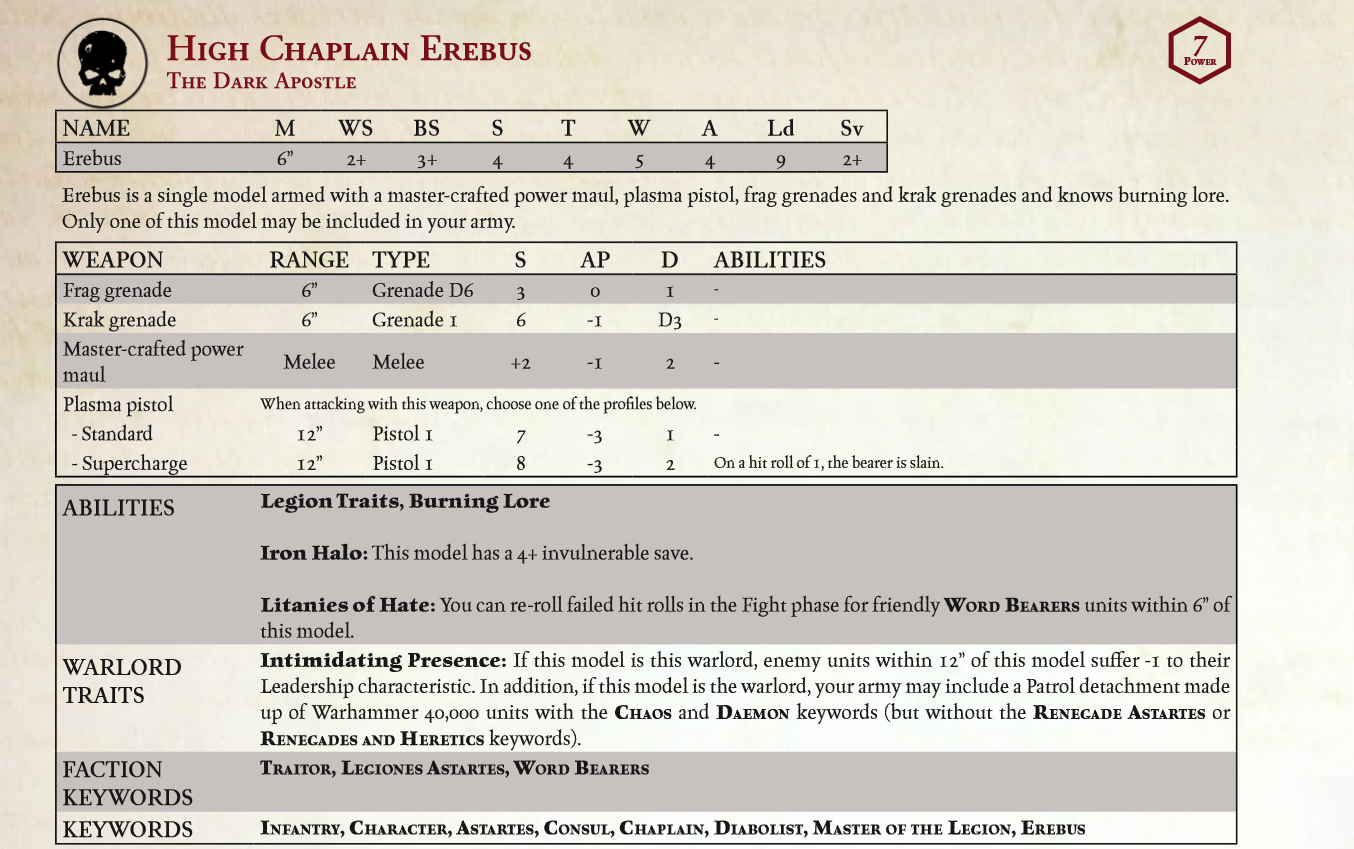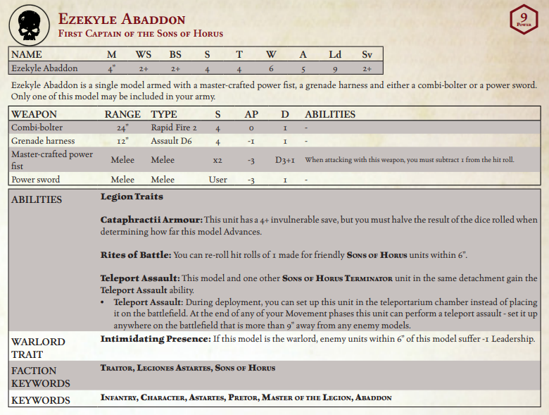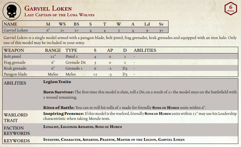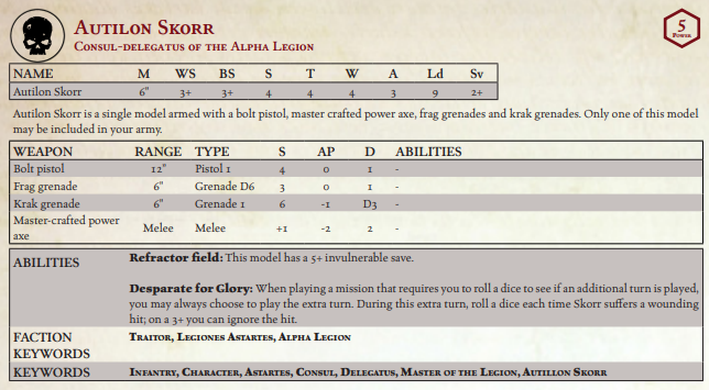 Legion Traits (AL) • Mutable Tactics: Before setting up your first unit, pick one ability from the list below. All alPha legIon astartes units gain this ability for the rest of the battle. • Feigned Deployment: At the start of the first battle round but before the first turn begins, you can move this unit up to 6”. It cannot end this move within 9” of any enemy models. If both players have units that can do this, the player who is taking the first turn moves their units first. • Advance Deployment: When you set up this unit during deployment, it can be set up anywhere on the battlefield that is more than 18” from any enemy models. • Technical Secrets: When targetting enemy Vehicles, this unit may re-roll Wound rolls of 1. • Combat Stimulants: If this unit charged or was charged in the Charge phase, it may re-roll Hit rolls of 1 in the following Fight phase. • Advance Surveying: This unit ignores any negative effects from Battlefield Terrain. • Martial Hubris: If an army containing an alPha legIon Detachment has suffered more destroyed units than the enemy army at the end of the game then it gives the opponent +1 VP.