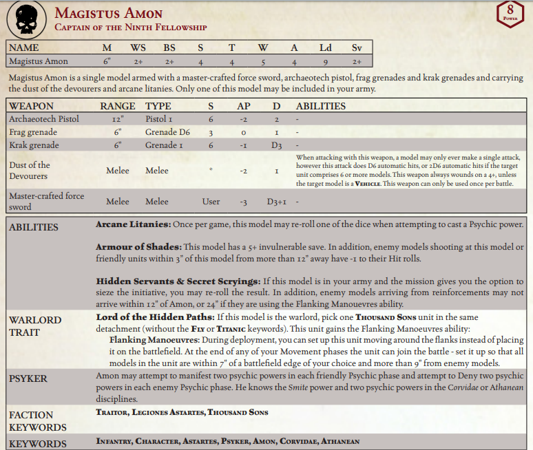 Что нам интересно: плюшки Амона на -1 к касту псякров в 18" и реролл колов на тухит, если не двигался, не действуют. А вот Кроль снижает его лидерство и психик тесты на 1 и заставляет ловить перила на каждый дубль. Алсо, ее нельзя выцеливать психосилами, так что Амону есть смысл брать только те силы, которые баффают его самого.