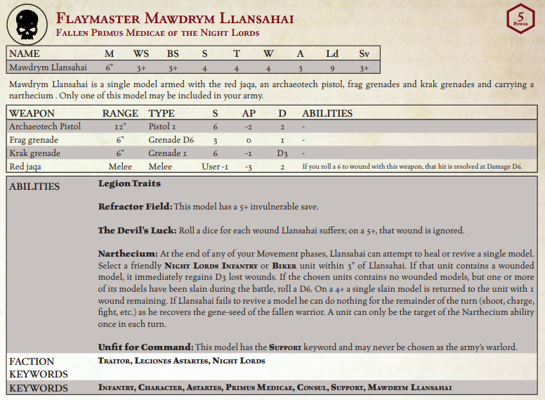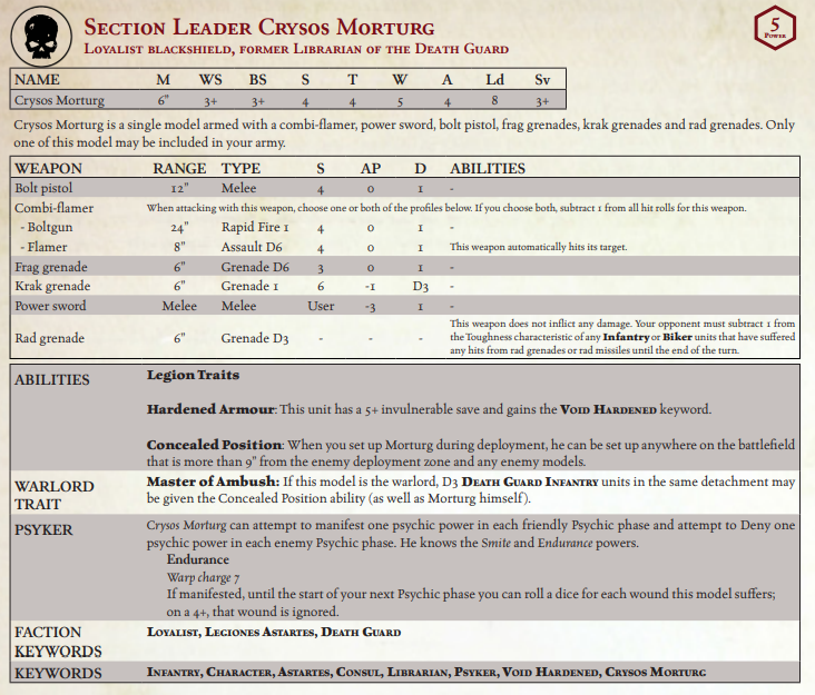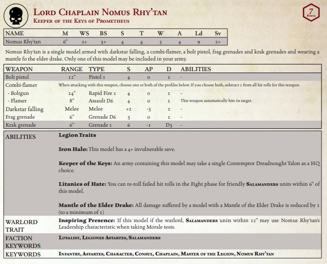 Legion Traits (SL) • Strength of Will: Units with this ability ignore any negative modifiers to their Leadership characteristic. • Promethean Cult: Reduce the Strength of any flamer attack made against a unit with this ability by 1. For the purposes of this trait, a flame weapon is any weapon whose name includes the word ‘flame’ (e.g. flamer, heavy flamer, flamestorm cannon). • Nocturne Born: When Advancing or charging, models with this ability reduce the dice roll by 1.
