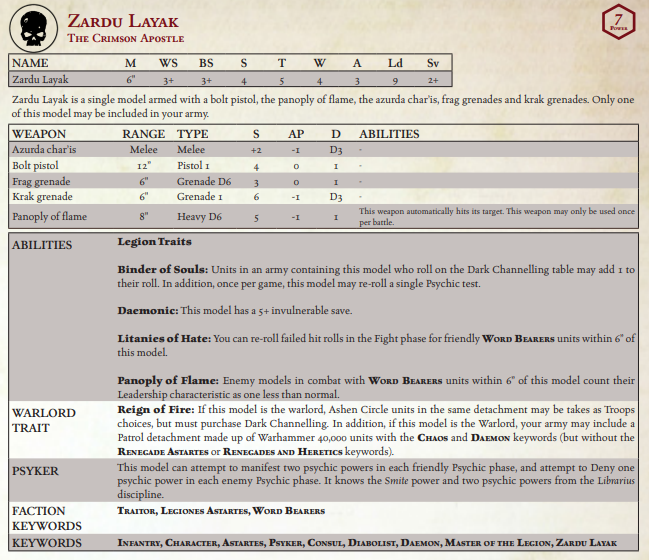Legion Traits • True Believers: Models with this ability can re-roll failed Morale tests. • Infernal Knowledge: traItor Psykers and DIaBolIsts with this ability can make use of Daemonic Rituals. • Charismatic Leadership: If your army includes any Legiones Astartes Detachments with the worD Bearers keyword, the largest one must fill all available HQ slots, and one of it’s HQ choices must be a model with either the CenturIon or ChaPlaIn keywords. If no qualifying detachment exists in your army, ignore this rule.