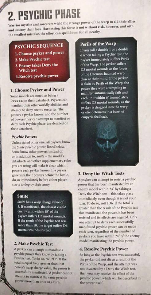 Напоминаю, как выглядят перила. If you roll a double 1 or a double 6 when taking a Psychic test, the psyker immediately suffers Perils of the Warp. The psyker suffers D3 mortal wounds as the forces of the Daemon-haunted warp claw at their mind. If the psyker is slain by Perils of the Warp, the power they were attempting to manifest automatically fails and each unit within 6" immediately suffers D3 mortal wounds, as the psyker is dragged into the warp or else detonates in a burst of empyric feedback.
