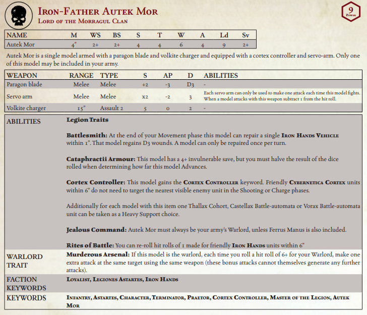 >>77982 Возьми профиль железного отца Фейрроса из железных рук. 5 мув, 3 ВС, 2 БС, 4 сила, 5 тафна, 7 вунд, 5 атак, 9 лидак, 2 сейв. Оружие Болт-пистолет пистолет 1 12 4 0 1 Гнев Горгона хеви 3 36 5 -2 2 Топор мили +3 -2 2 2 серворуки х2 -2 3, может делать не больше 1 атаки за ход каждой серворукой, при атаке вычитает 1 из броска тухит. Общее правило спейсмаринов - ангелы смерти - переброс лидака, шок ассолт - +1 атака если чарджил, делал героик или был почарджен, боевые доктрины - получает дополнительный +1 ап на хеви оружие и гранаты в первый раунд боя, на ассолтное и рапидное во второй, или во второй и третий, и на рукопашное и пистолеты в третий или четвертый и последующие. Правила - Сигнум - В начале шутинг фазы выбрать юнит железных рук в 3', этот юнит получает 2 бс до конца фазы Артифишер бионика - 5 фнп Раздает 5 инвуль пехоте железных рук в пределах 6 дюймов вокруг себя Благословление Омниссии - может восстановить 3 потерянных вунды технике железных рук в пределах 1 дюйма от него.