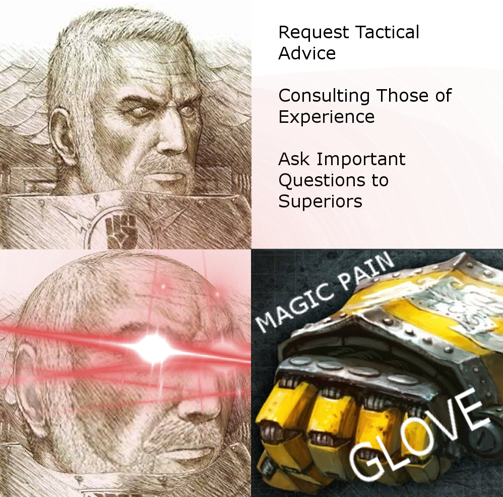>>80270 - Солдаты СПО, к вам обращается Священное Сестринство. Мы прибыли к вам на помощь в борьбе с проклятыми еретиками! - Ура! Мы спасены! - Всегда думаешь только о себе. - Что? Не понял. Нас атакуют культисты! Нужна помощь! - То есть моё мнение для тебя пустое место? - Мы под сильным огнём. Скажите, свои координаты. - Ты мне скажи. Ты ж у нас всегда самый умный. - В чём проблема? - Да ни в чём уже. - Лучше б я был сервитором.