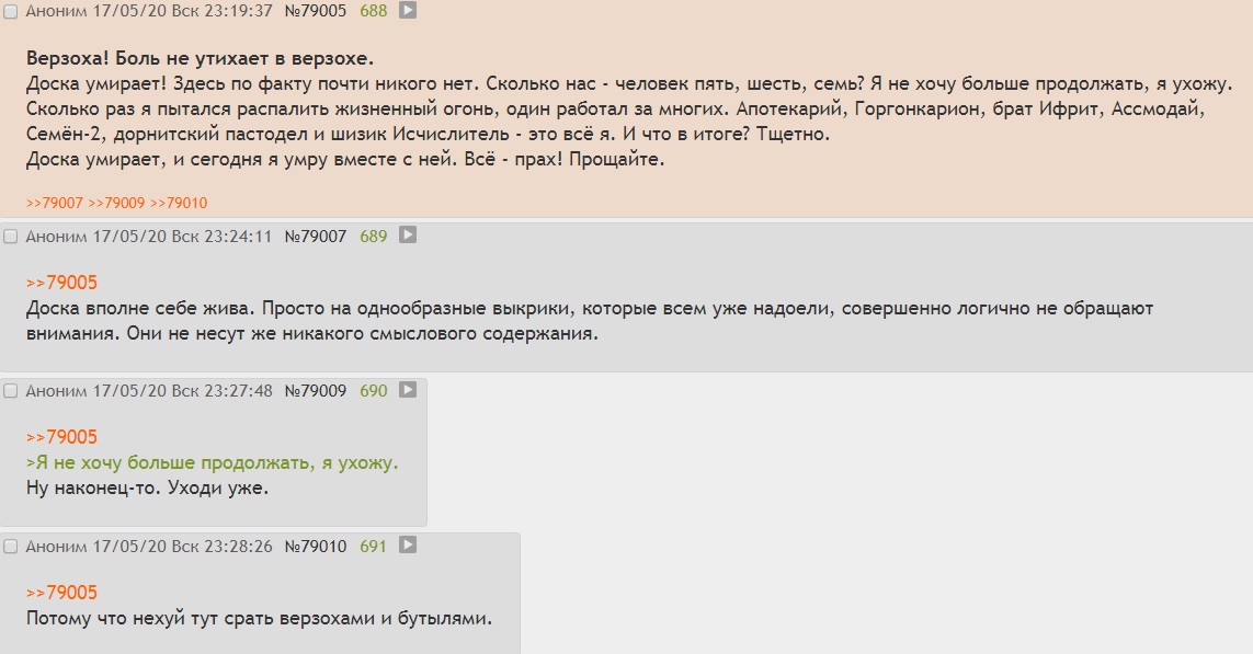 Однако мощно рвануло с одного-единственного слова, не ожидал. Доска названа по аналогии с Империумом Нихилус. Как назвались - то и получили, вас никто не просил именно это название брать. Раз. Эта доска построена на пепелище старого ЖВТ, который уже тогда покатился в говно, на чужом несчастье счастья не построишь, знаешь такое? Два. И происходящее здесь наглядно эту поговорку подтверждает: доска родилась в скандале и скандалы здесь и без меня не утихали, теперь к этим скандалам примешался еблан, который может ебнуться окончательно и напускать сюда хуй пойми кого и чего. Три. И что хуже всего - здесь активно плодят сущностей, персонифицируют, т.е. ты уже не человек, а фантом ебаный, ты уйдешь - нацепят твою маску и будут ололокать. Заебись, правда?