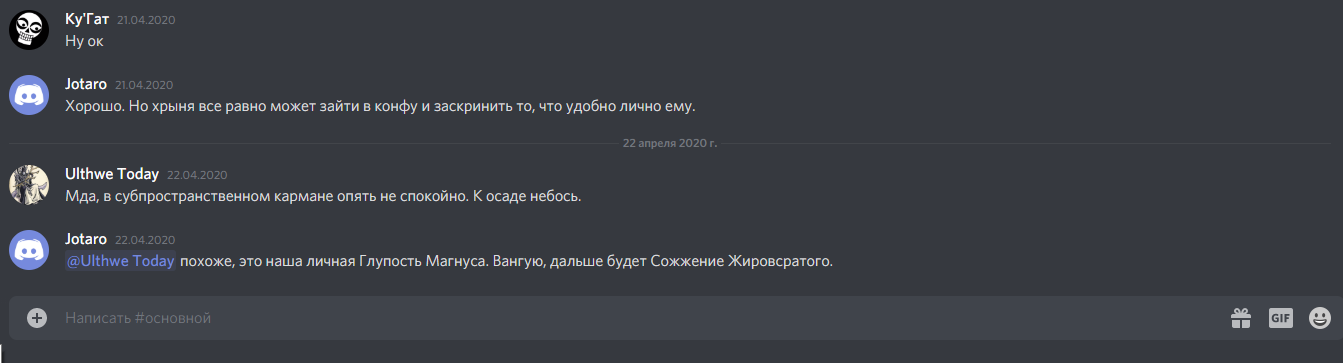 Вот видите, ни одной верзохи за сегодня! Бойцы ДжоКока соблюдают договорённости, достигнутые в том числе благодаря моей дипломатии. Надеюсь, тред в свою очередь начнёт отказываться от стигматизации несогласных. Зря Хаар в админке бесновался, совершенно зря. Силовыми методами этот конфликт не решить.