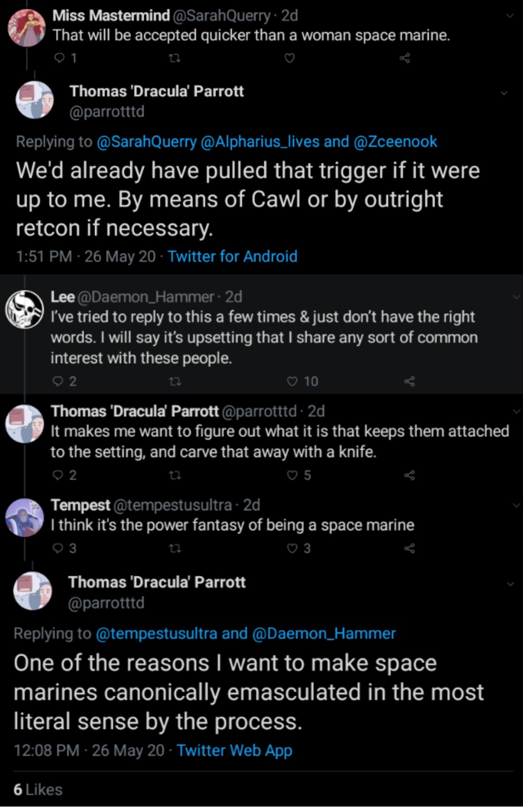 >>81856 Нигде. Автор БЛ, написавший как минимум одну книгу, выражает желание "pull that trigger" (космодесантниц) и сделать СМ "canonically emaculared in the most literal sense", скопцами, иначе говоря. Однако все это лишь его собственные хотелки, если даже не простая вежливость.