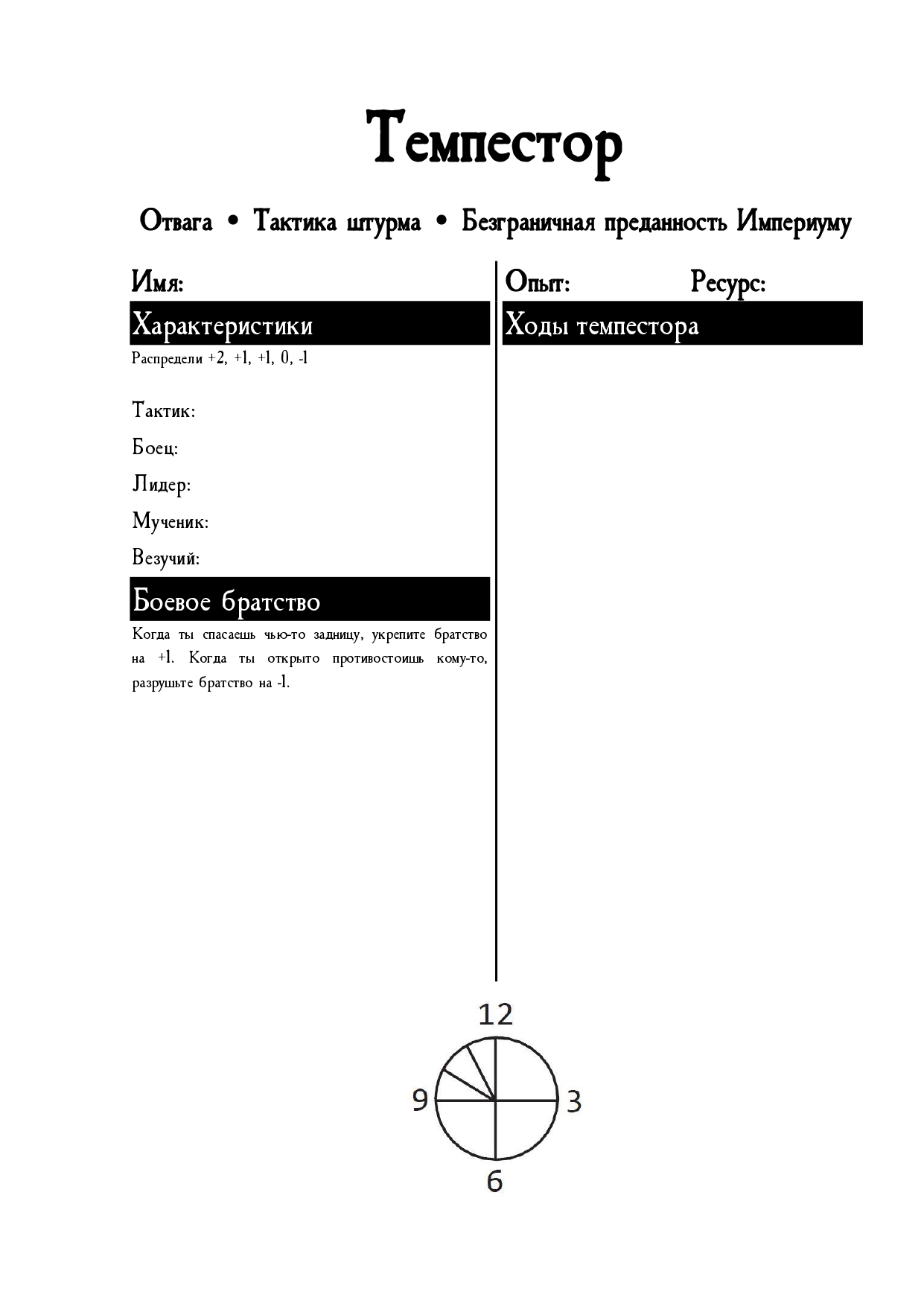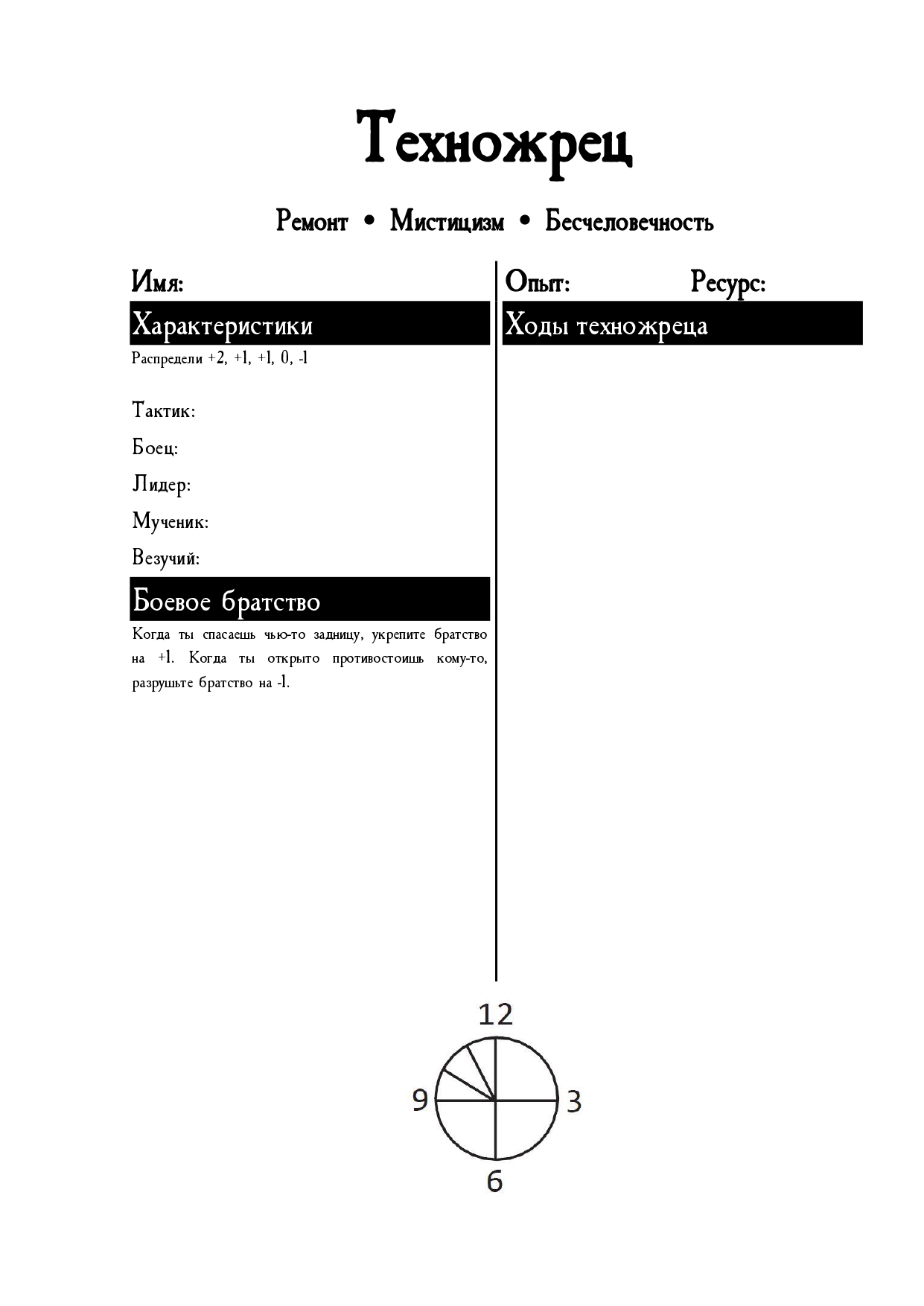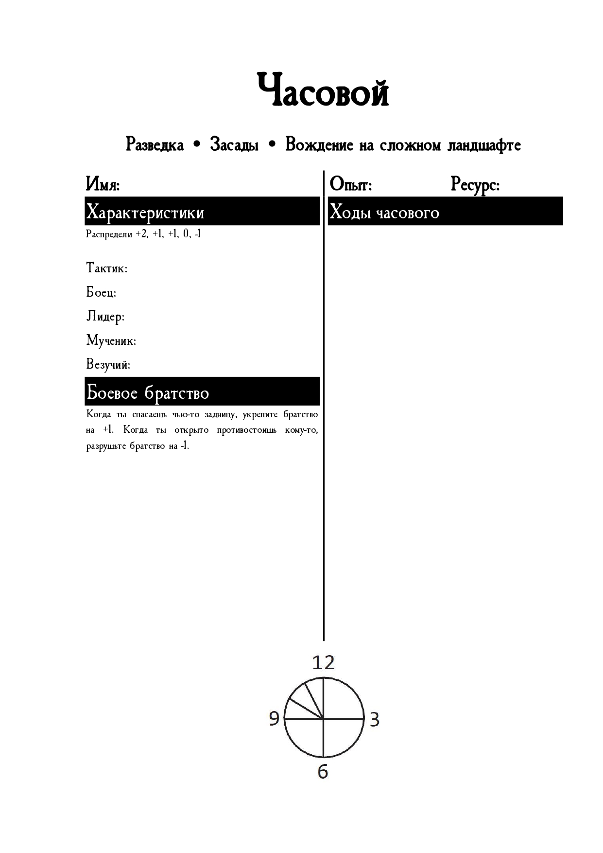 Опыт: Каждый раз, бросая подчеркнутую характеристику, вы получаете 1 опыт. Когда ваши узы боевого братства достигают 4 или опускаются до -2, обнулите братство с этим персонажем и отметьте опыт. За 5 единиц опыта вы получаете новый ход.