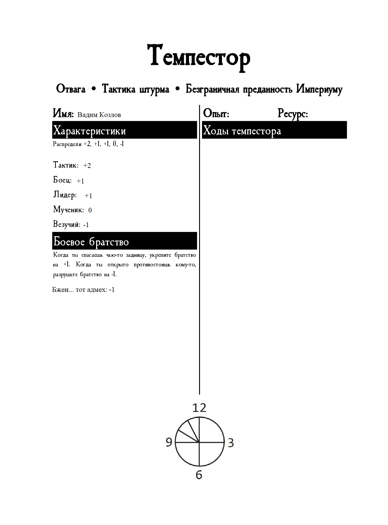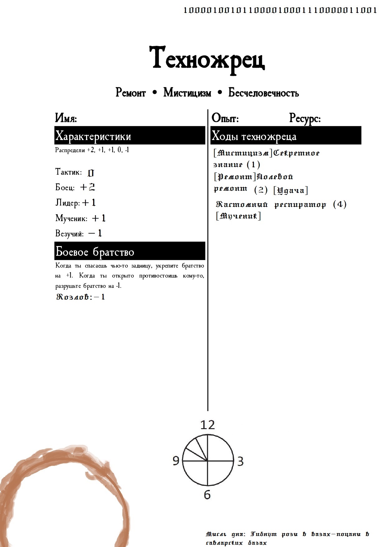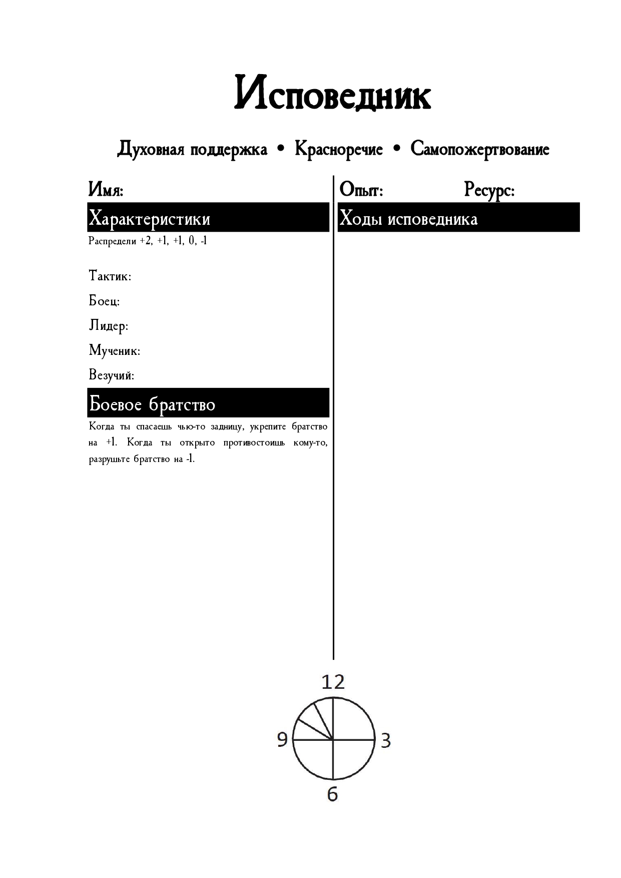 Опыт: Каждый раз, бросая подчеркнутую характеристику, вы получаете 1 опыт. Когда ваши узы боевого братства достигают 4 или опускаются до -2, обнулите братство с этим персонажем и отметьте опыт. За 5 единиц опыта вы получаете новый ход.