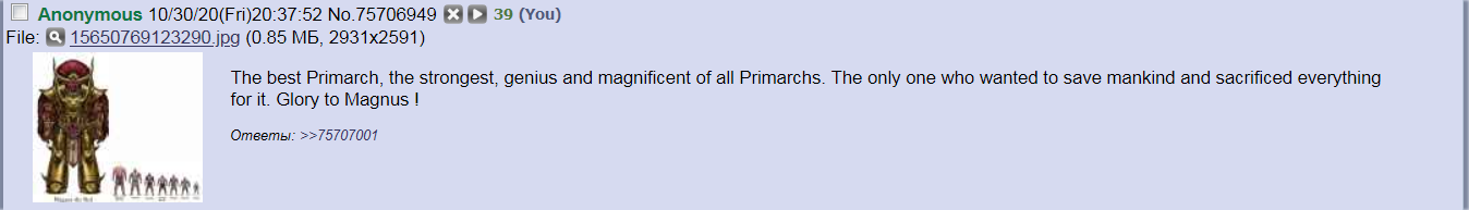 >>101421 На мочегнойном, местный админ-душнила, неистово исстребляет все, что не связно с миньками, даже обсуждения кодексов иногда. А тут мы все вместе с шизиками и семенами грудимся и нету больше разброда среди мужебратьев, и слава Императору.