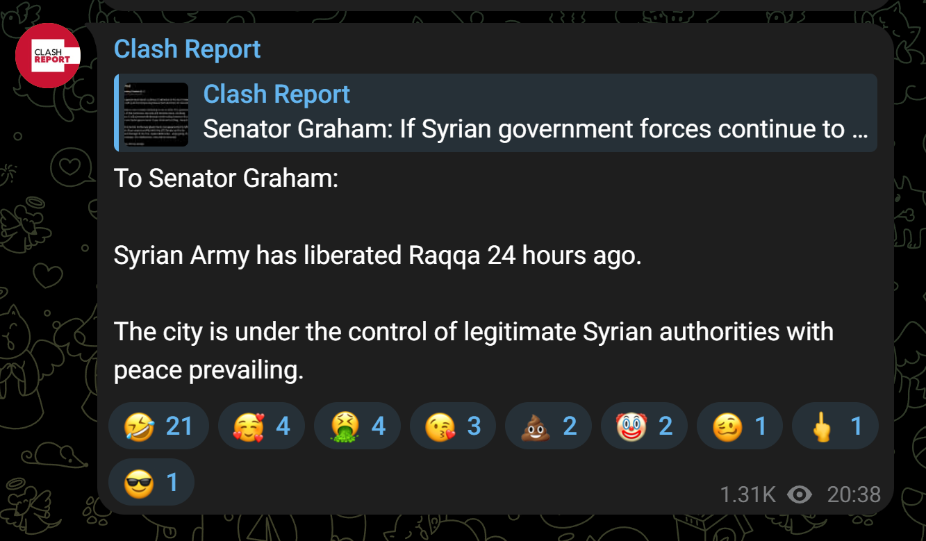 Конфликт между Израилем и режимом Джулани это самоочищающаяся зона нестабильности, где мы заинтересованы видеть максимальное ослабление обеих сторон. Друзские анклавы создают дополнительную нестабильность, поддерживая общую обстановку напряженности, но их влияние ограничено. Турция сохраняет пассивную позицию. Исходя из текущих реалий, оптимальным будет игнорировать этот конфликт и позволить этим мудакам продолжать взаимное истребление.